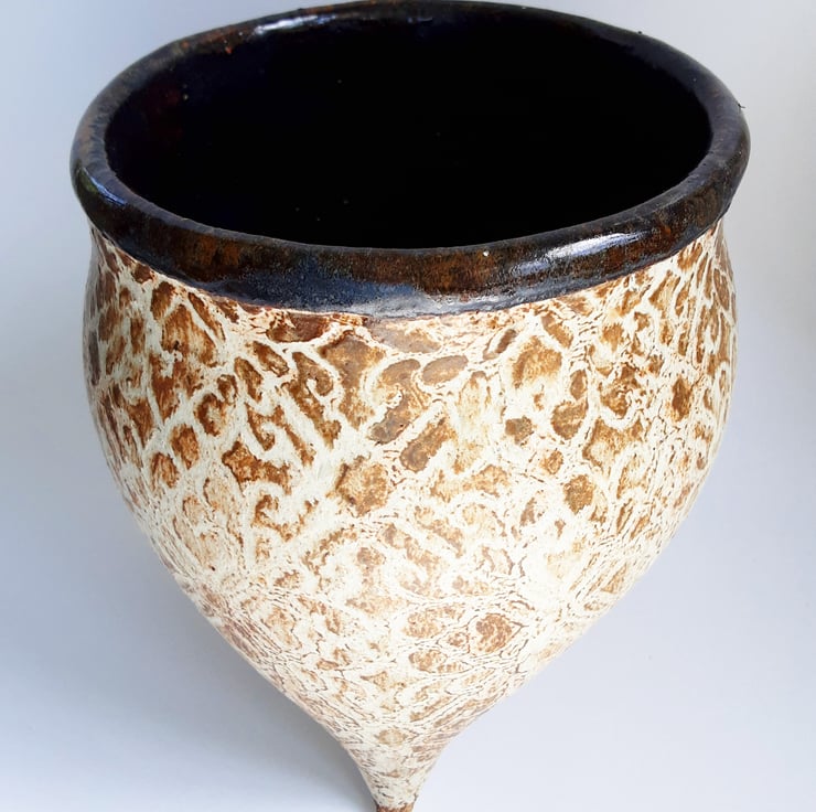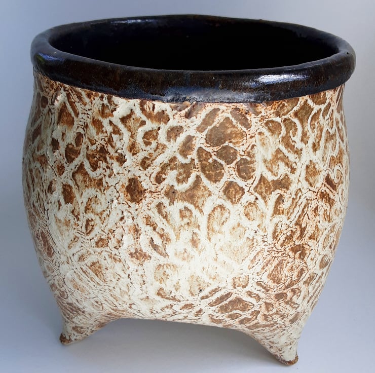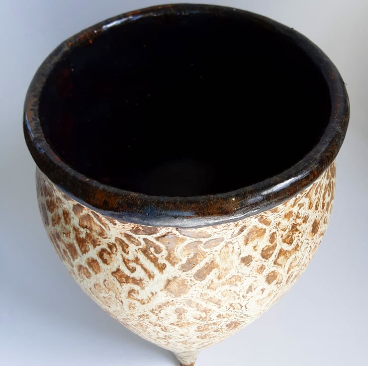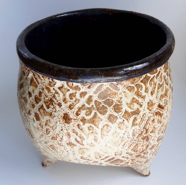 Glazed in brown glazes on the outside and blue glaze on the inside. It has a pattern around the outside