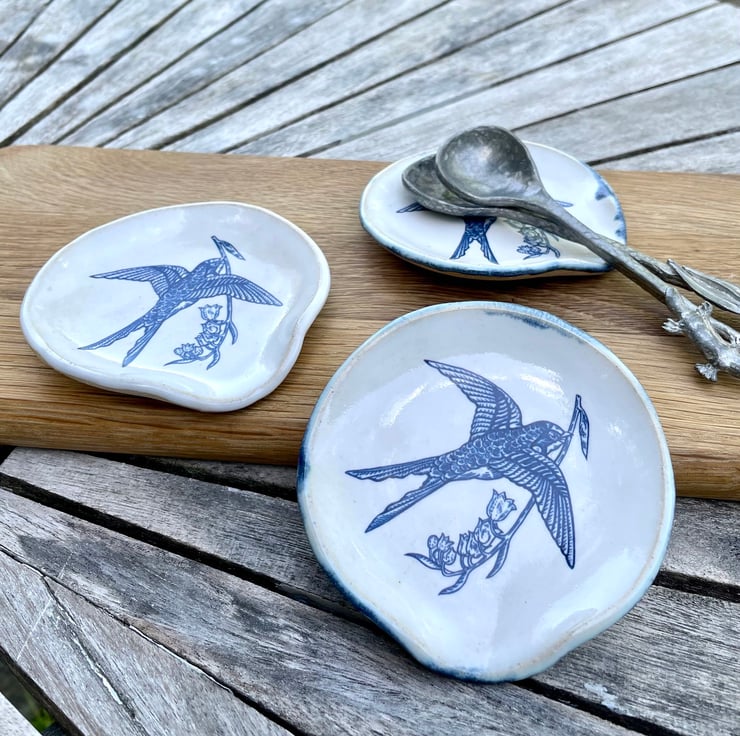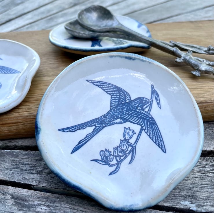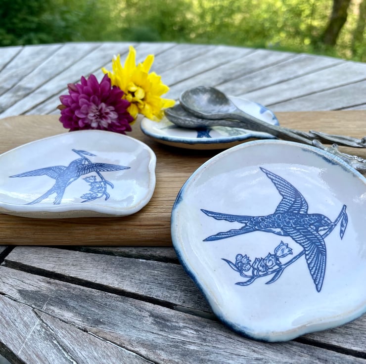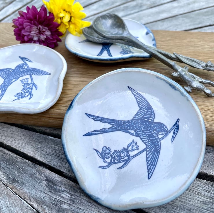 Original illustration of a swallow is from a collaboration with Ben Rhodes at House of Hawks. The image is taken from his original watercolour and fired onto my pottery in a third firing to make it robust and part of the pottery piece.