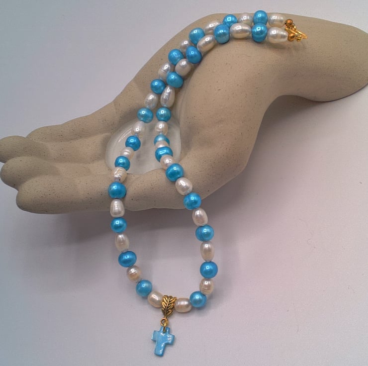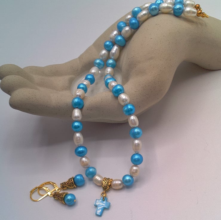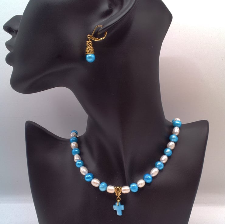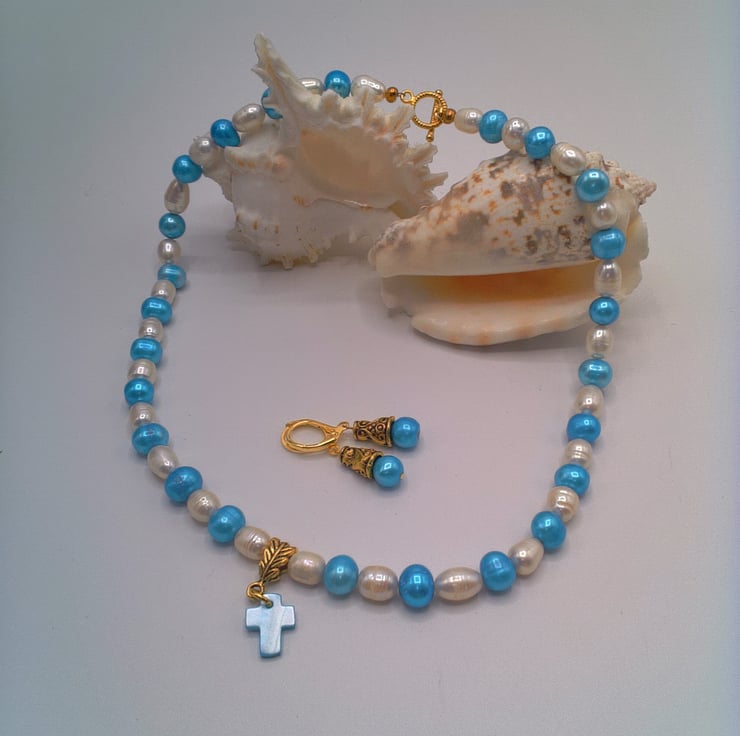 Blue and Cream Freshwater Pearl Jewellery Set With A Shell Cross, Gift Set, Pearl Jewellery Set, Pearl Necklace, Pearl Earrings, Shell Cross, Freshwater Pearl Jewellery, Birthday Gift, Anniversary Gift, Gift for Her, Gift Set