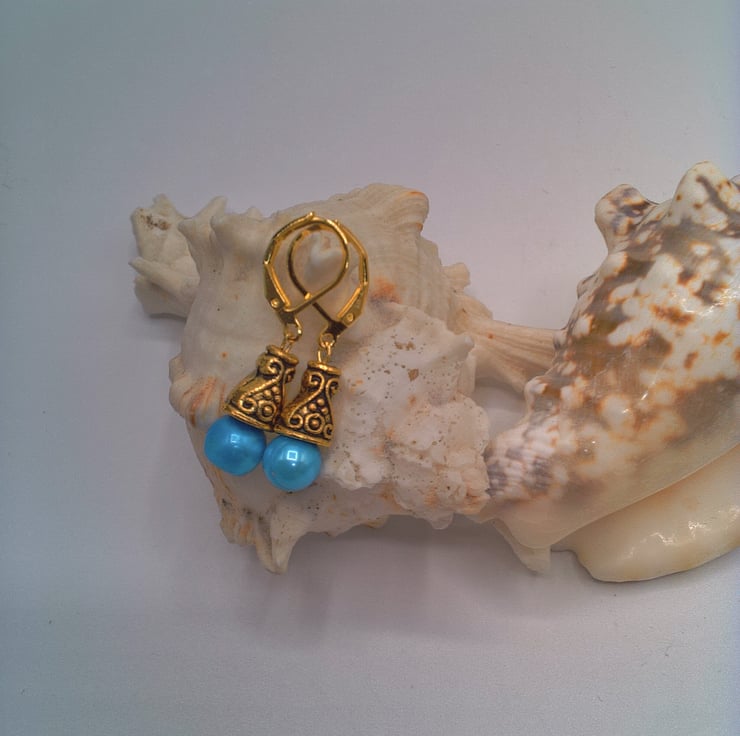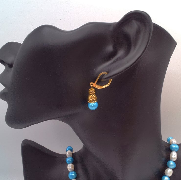 This beautiful blue and cream freshwater pearl jewellery set comprises a necklace and a pair of earrings. It would match well with an outfit for any special occasion. The necklace is made using 6 mm blue and cream freshwater pearl beads, with a gold plated leaf bail holding a blue shell cross charm. The earrings have gold plated bead cones and ear wires, the necklace has a gold plated toggle clasp. The necklace is 16.25 inches (41.5 cm) in length with a drop of 1.5 cm for the cross charm and the earrings have a drop of 0.75 inches (20 mm) from the base of the ear wire. The jewellery set will be dispatched wrapped in tissue paper in an organza bag and delivered to you via Royal Mail first class post. This jewellery set would make an ideal gift for a lady who loves pearls.