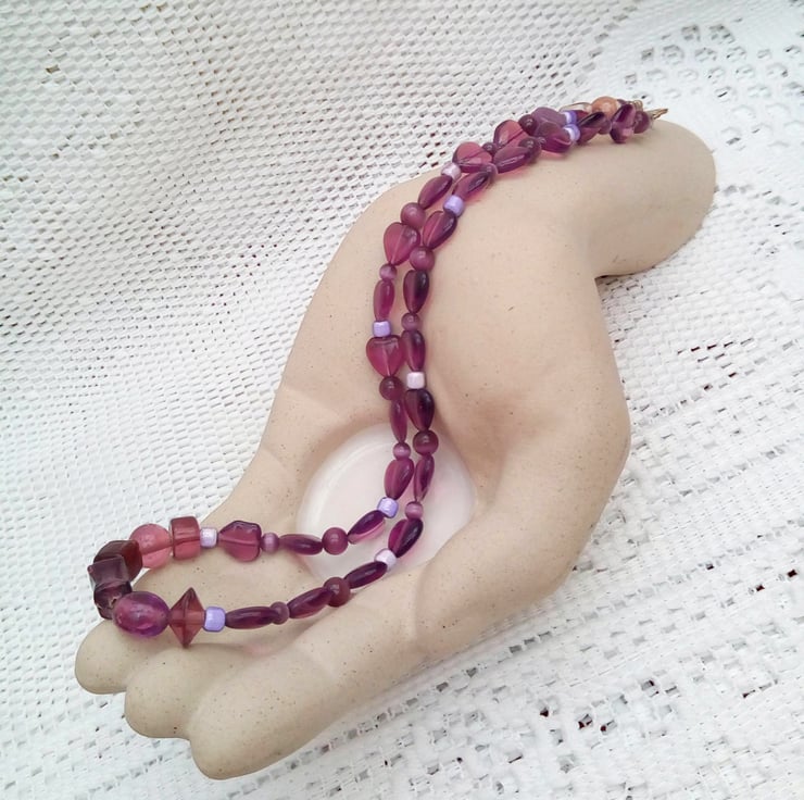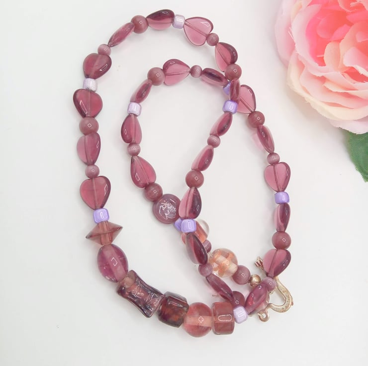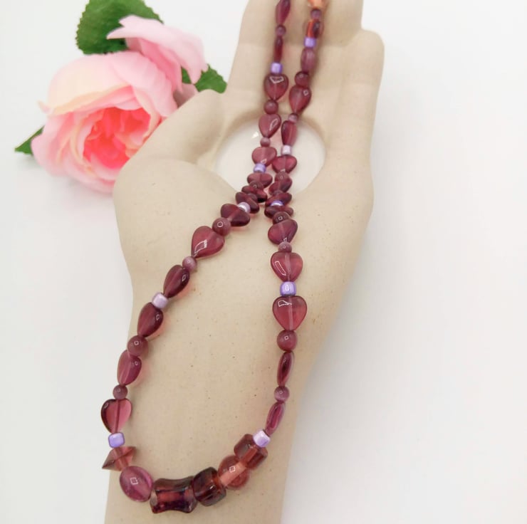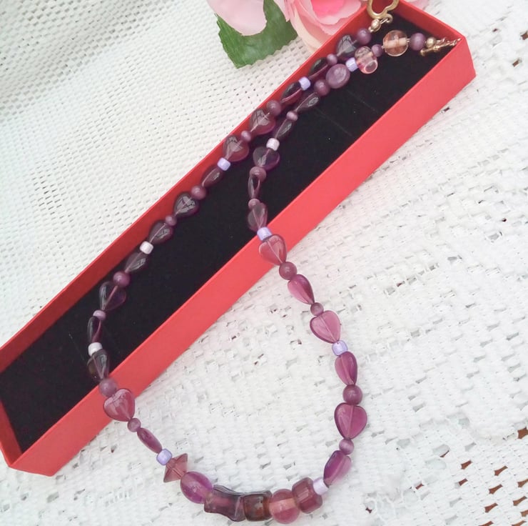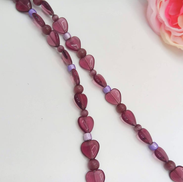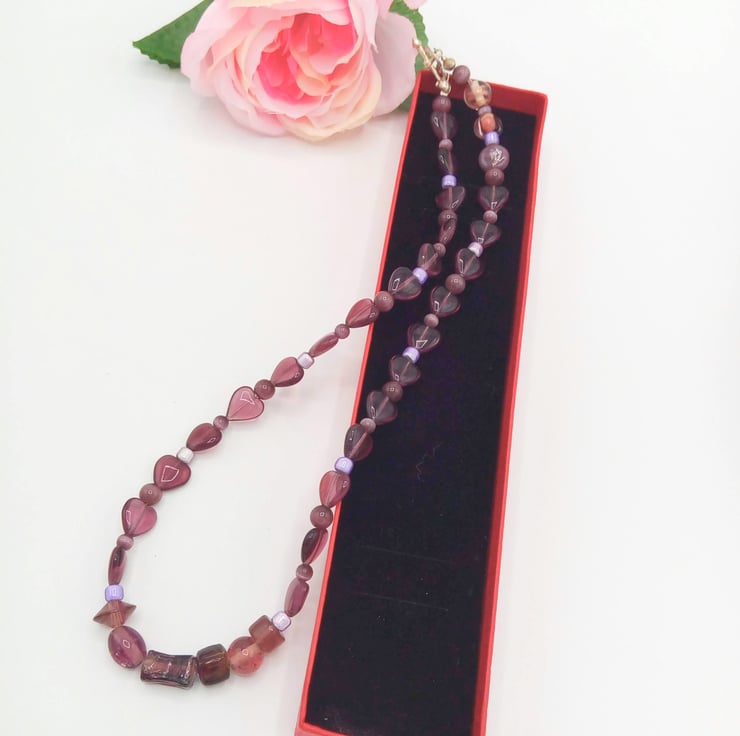 The dainty elegant necklace is made using 10 mm x 10 mm purple glass heart beads, 3 mm purple seed beads, and a mixture or other shapes and sized of purple glass beads. It is secured with a lovely silver plated heart toggle clasp. The necklace is 18 inches (46 cm) long in total.