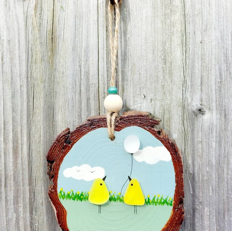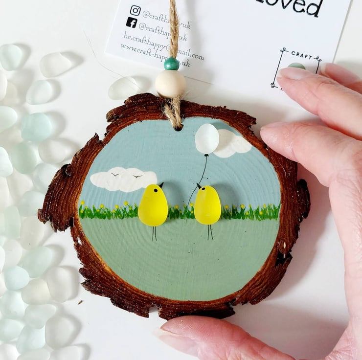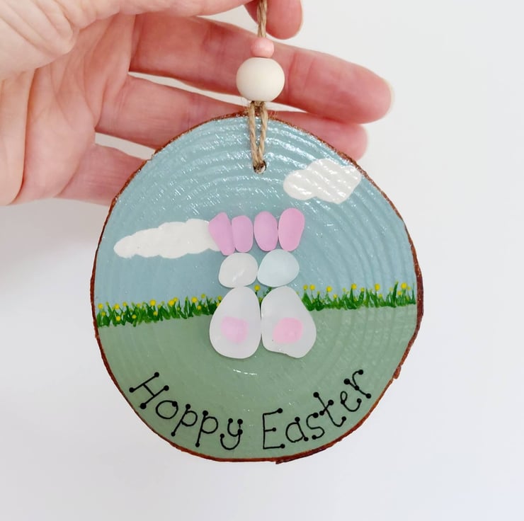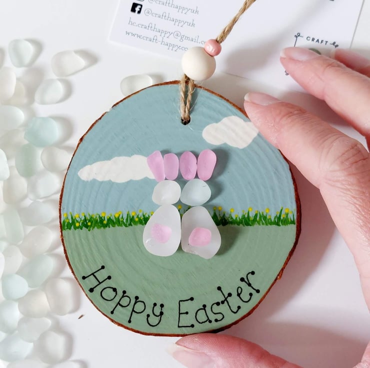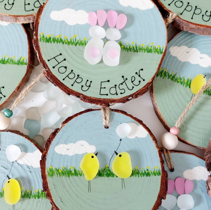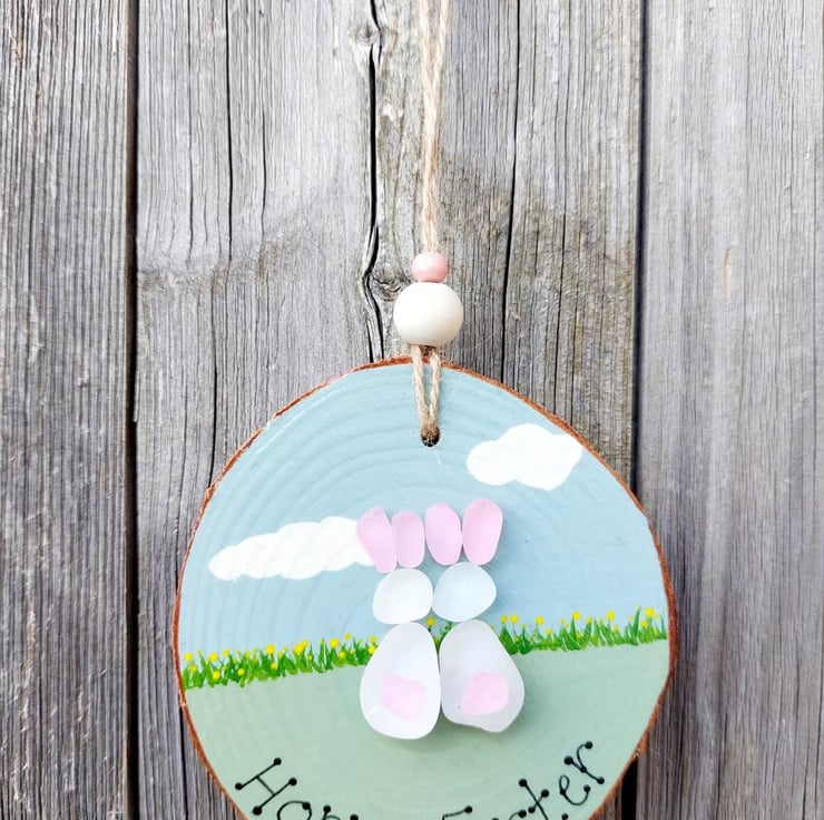 Choose from two gorgeous sea glass hanging decorations, cute bunnies or Easter chicks. Both have beautiful, hand painted, pastel coloured details, sea glass embellishments and are finished with natural jute and beads so they're ready to hang.