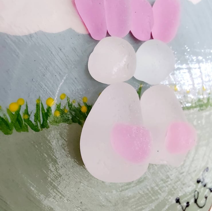 I'm slightly obsessed with Farrow & Ball emulsion at the moment, particularly these gorgeous pastel shades and I've been using them a lot in my designs. I used the natural tones as a background for this spring inspired design and embellished them with hand painted tumbled sea glass to create the most adorable bunnies and chicks..