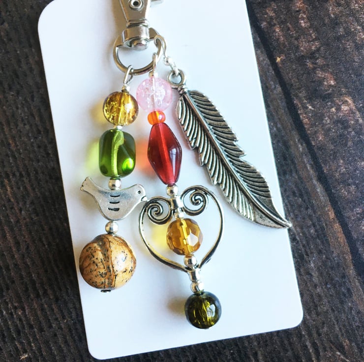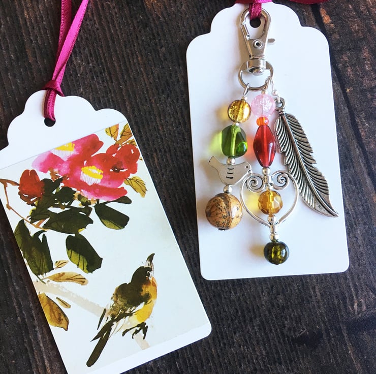 The bag charm has glass beads in tones to match the tag and a large semi-precious Picture Jasper bead. I've also used a tiny silver-tone bird and large feather charm.