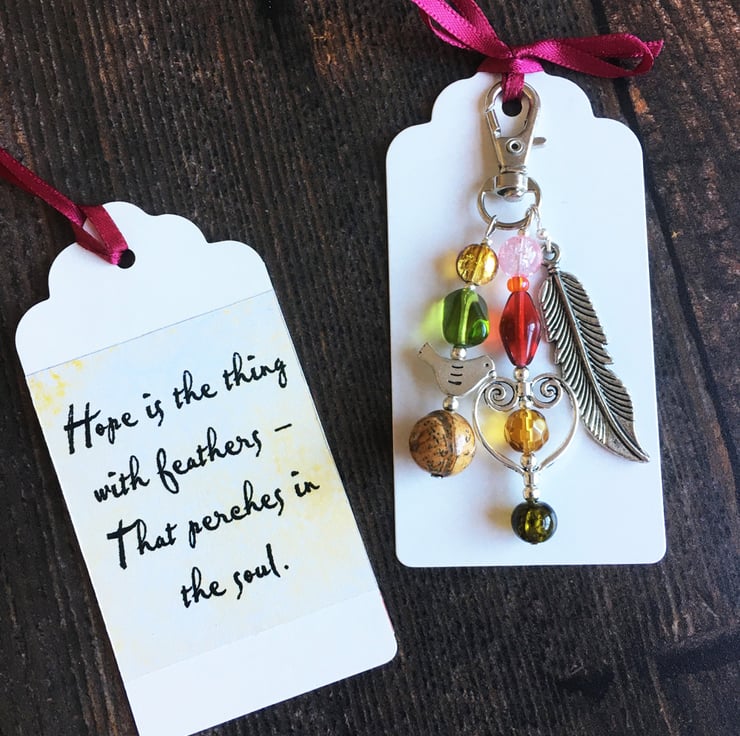 An uplifting little gift for a friend. This pretty bag charm and tag was inspired by lines from an Emily Dickinson poem "Hope is the thing with feathers..."