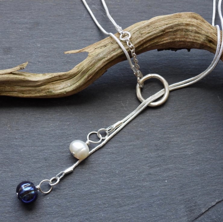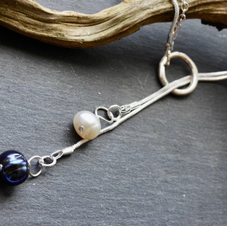 This necklace has so much sophistication, a white pearl and a black pearl. Each on it’s own chain, looped through a silver ring. The chains are a super slinky snake silver 20” long. The real pearls lie together and can be long or short as you would like, with the chains either as a choker or just loose, lots of wearing options. Great for evenings out or every day.