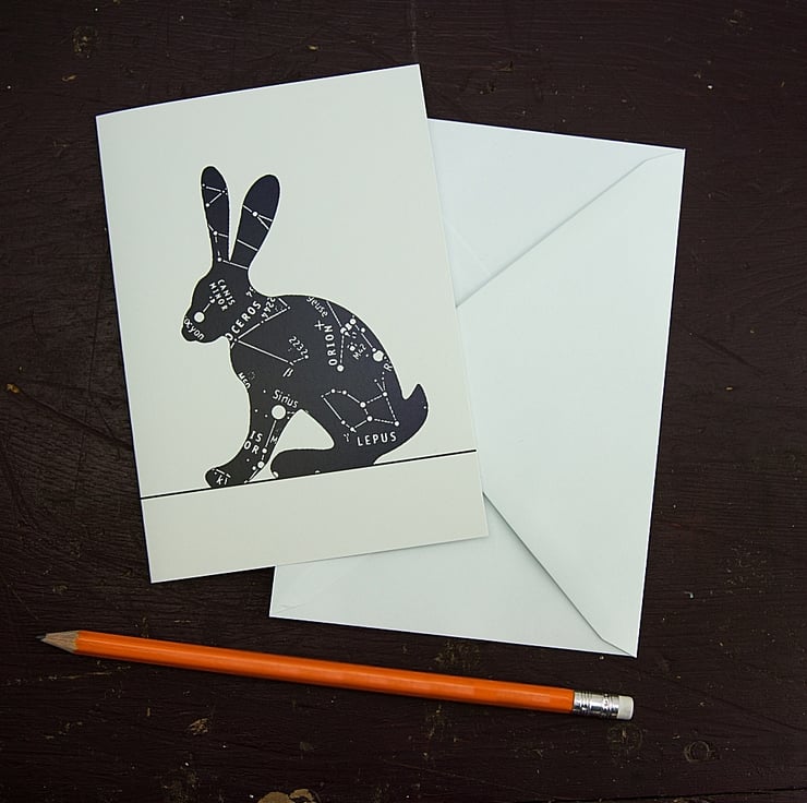 This Constellation Hare card is made from thick 340gsm, sustainably sourced paper stock. With a light satin coating on the outside, the inside is blank and left uncoated, making it easier for you to write your own message.