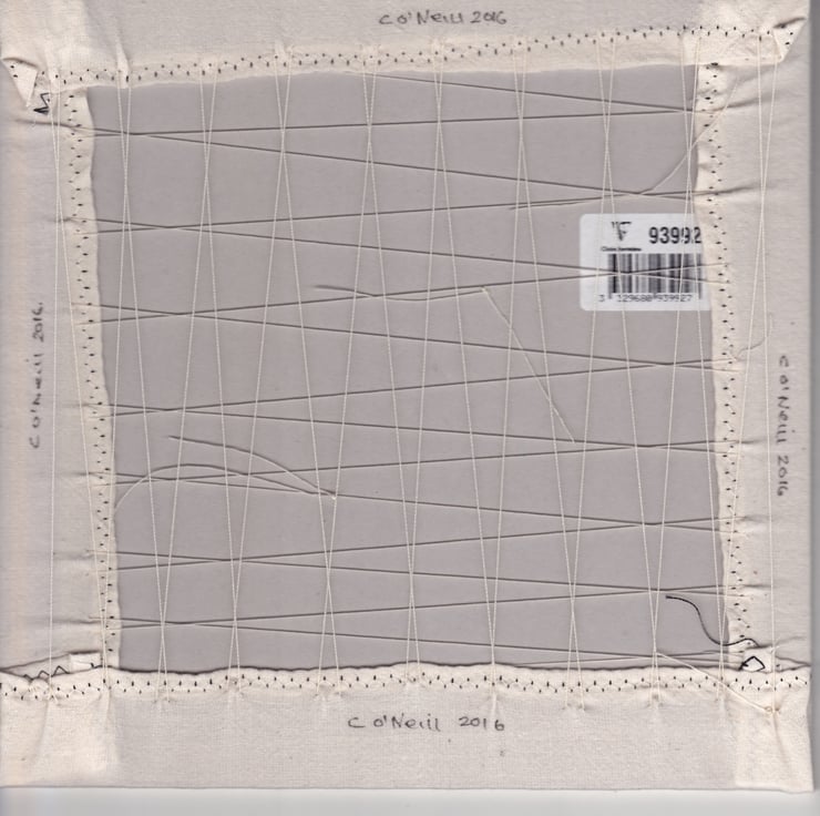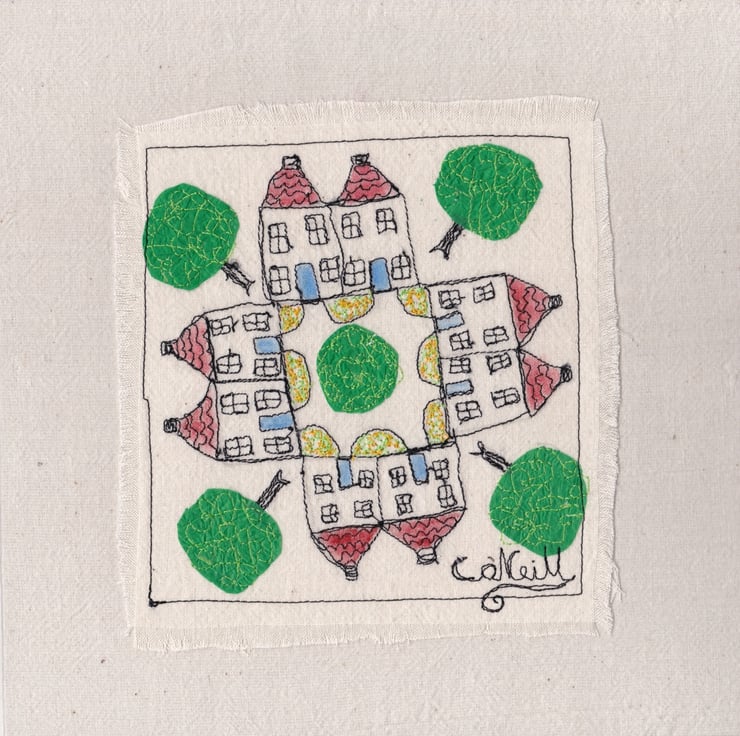 A little village square textile art. This little embroidery is sewn onto calico, It is a mixed media picture using coloured pencils, watercolour and tissue paper. It looks like a old fashioned sampler.I have stretched the embroidery on firm card using upholstery thread. See photograph of the back of artwork.