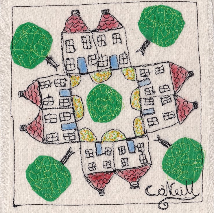 Loosely based on a little village near where I live. The square has neat little houses each with tidy gardens. They remind me of Beatrix potter illustration and one could almost imaging them being home to bunnies and hedgehogs in aprons.