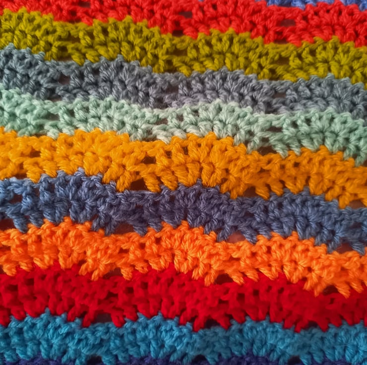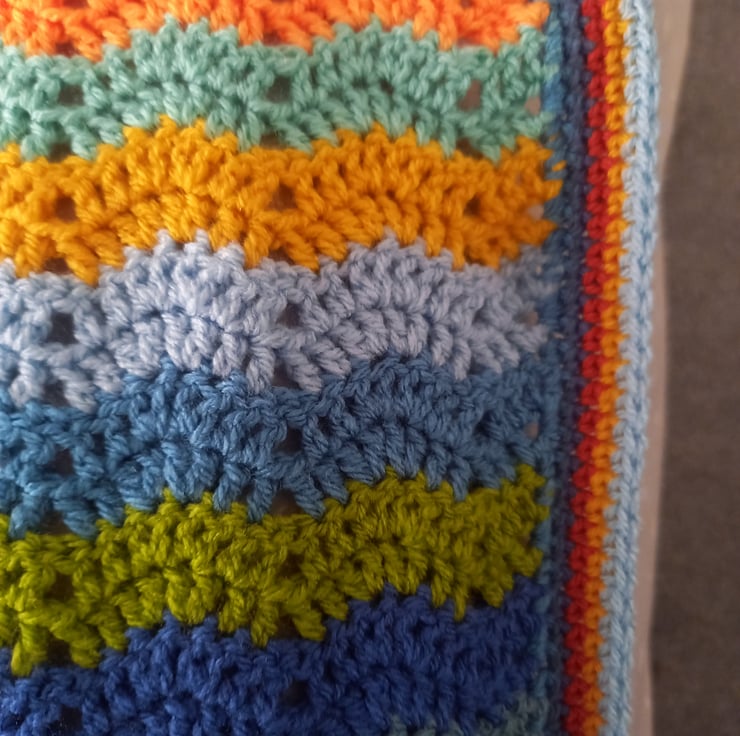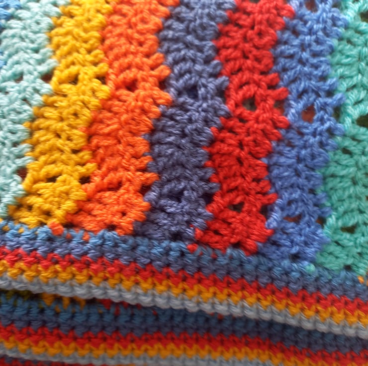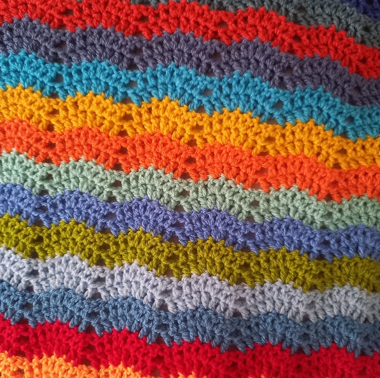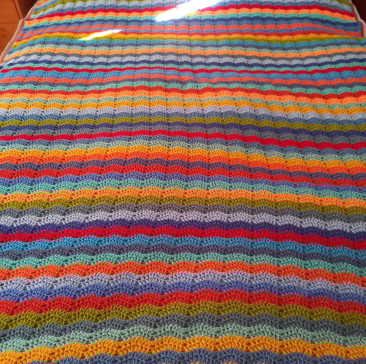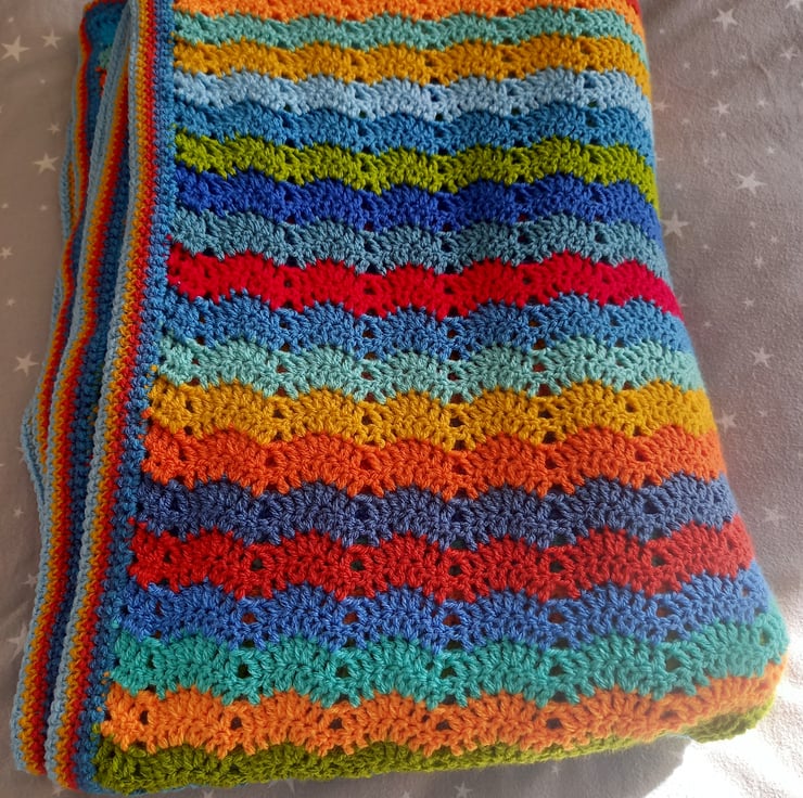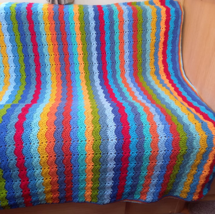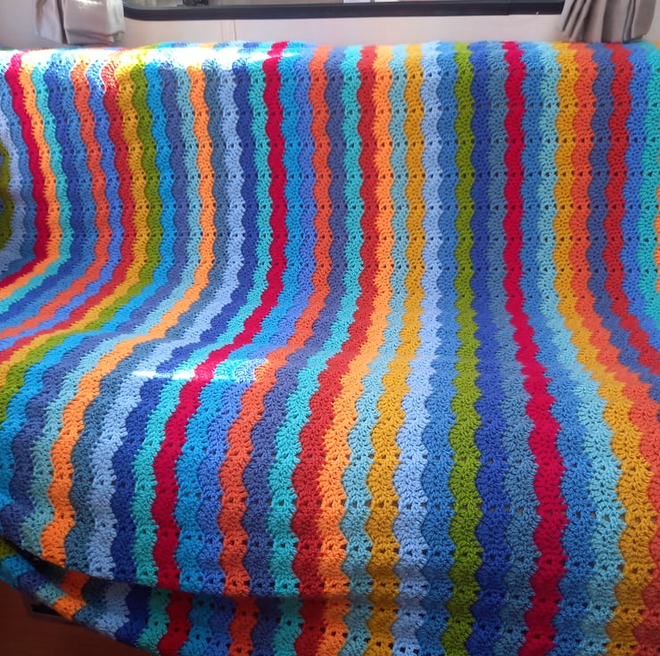 Colourful crochet blanket/throw, very soft warm and cosy, crocheted in an easy care machine washable yarn, in lovely cheerful bright colours. Blue, yellow, orange,red, green, crocheted in a pretty ripple stitch.