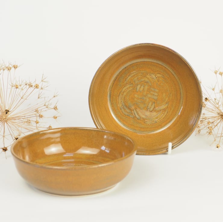 A small brown bowl in a glossy golden brown / mustard brown glaze. The bowl has been thrown on the wheel and impressed with a carrick knot. The glaze is foodsafe and has been selected to highlight the texture.