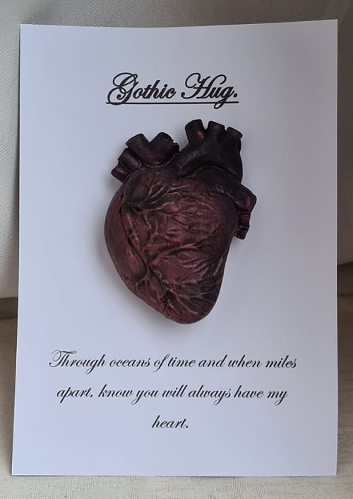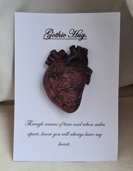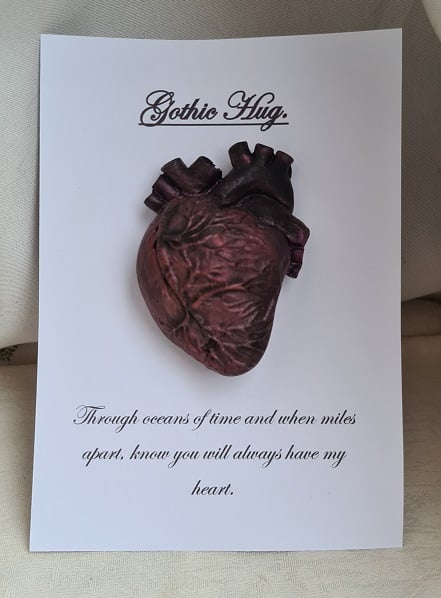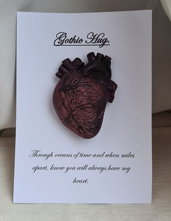 Gothic Hug Size - 7cm long x 5cm wide x 3cm deep. Heart is made of Resin coloured dark red and Black and is an anatomically shaped heart with a flat back. Comes on an A6 size card That Says "Gothic Hug" at the top and "Through oceans of time and when miles apart, know you will always have my heart" at the bottom.