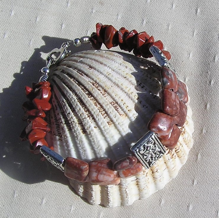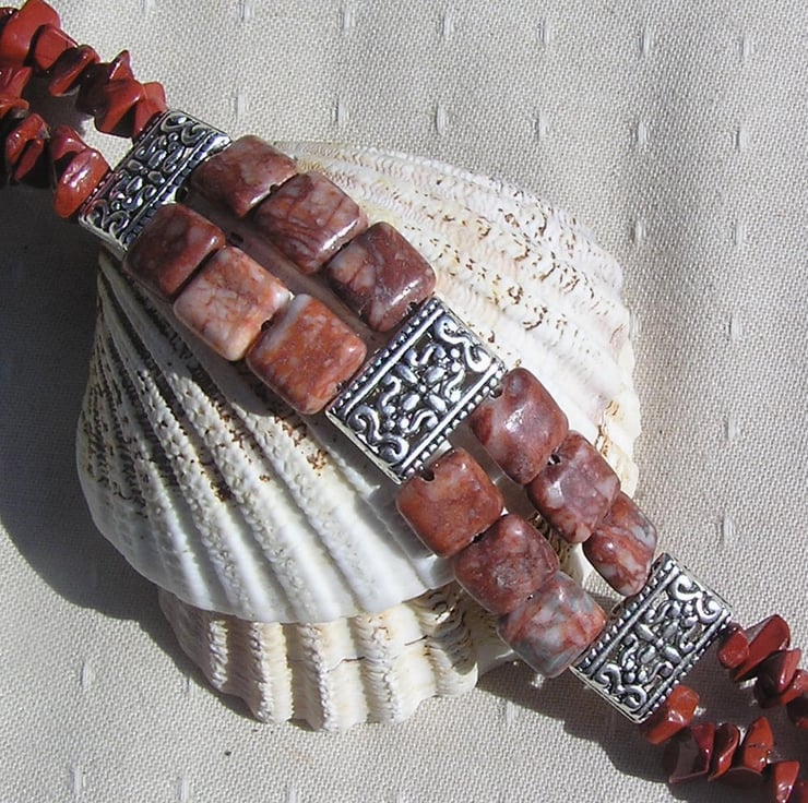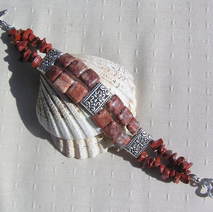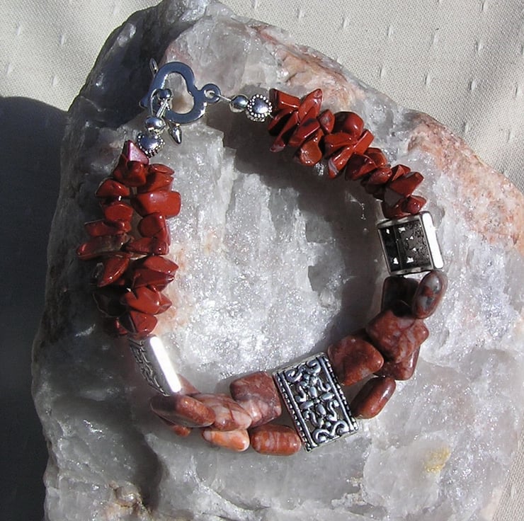 This Stunning Bracelet is made from Stunningly marked Red Picasso Jasper Square Beads and Red Jasper Gem Chips… each section separated by an ornately decorated Tibetan Silver Bar Spacer with a tiny Silver Heart at each end - a Beautiful combination that will look stunning either worn casually or with something more Elegant for a Special Evening out