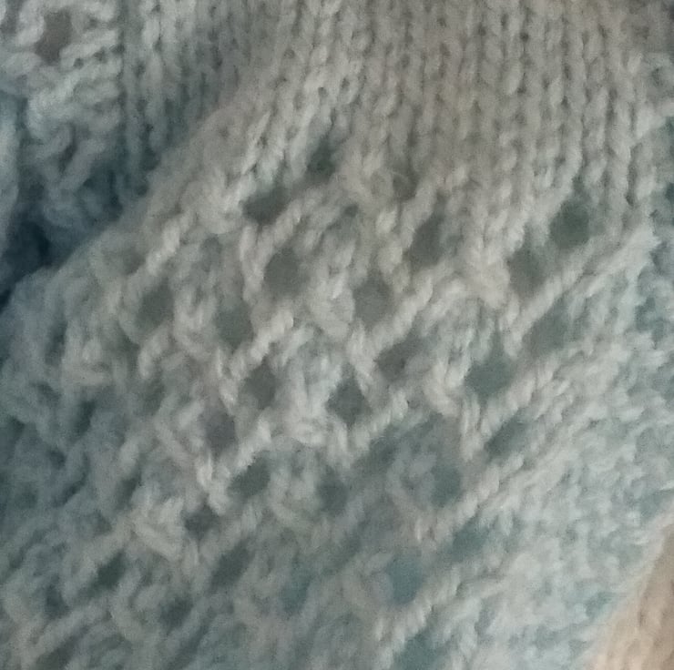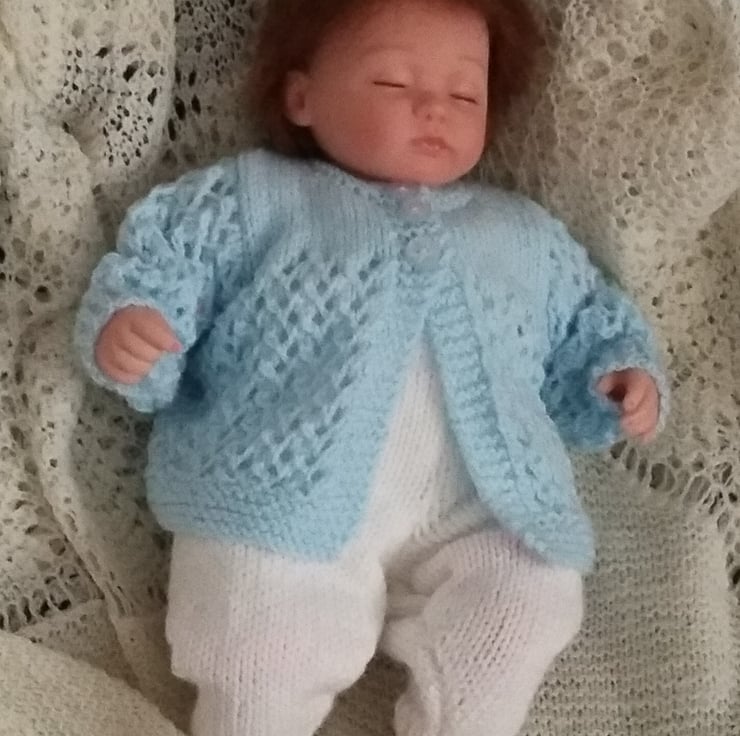 A TWO PIECE OUTFIT OF BLUE JACKET WITH WHITE JOGGERS HAND KNITTED IN DK BABY WOOL.