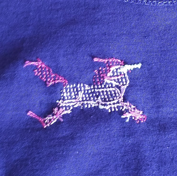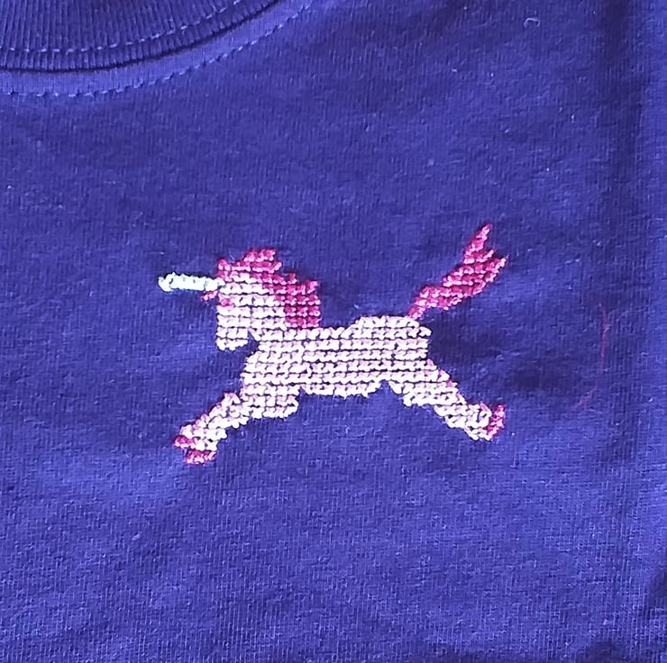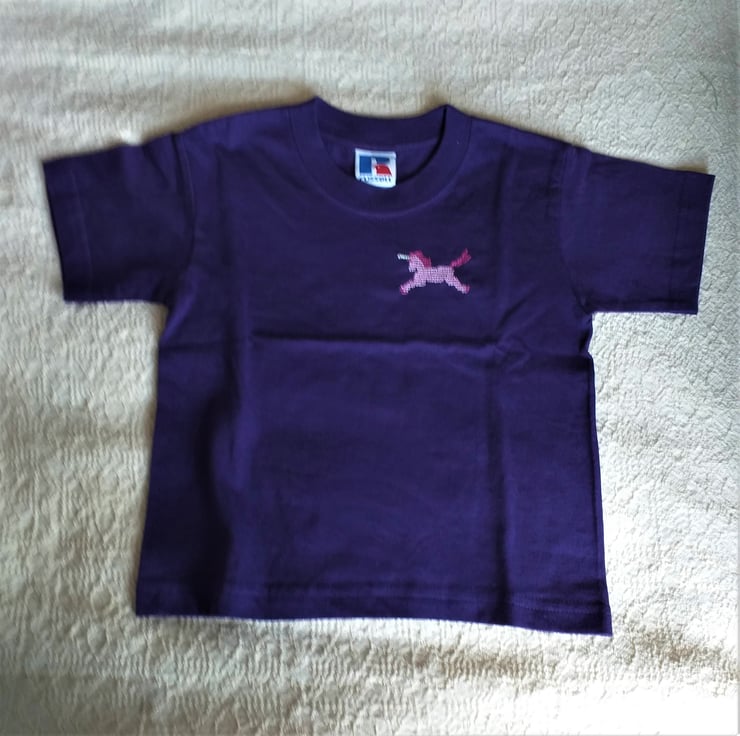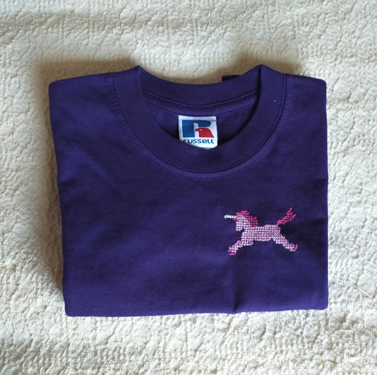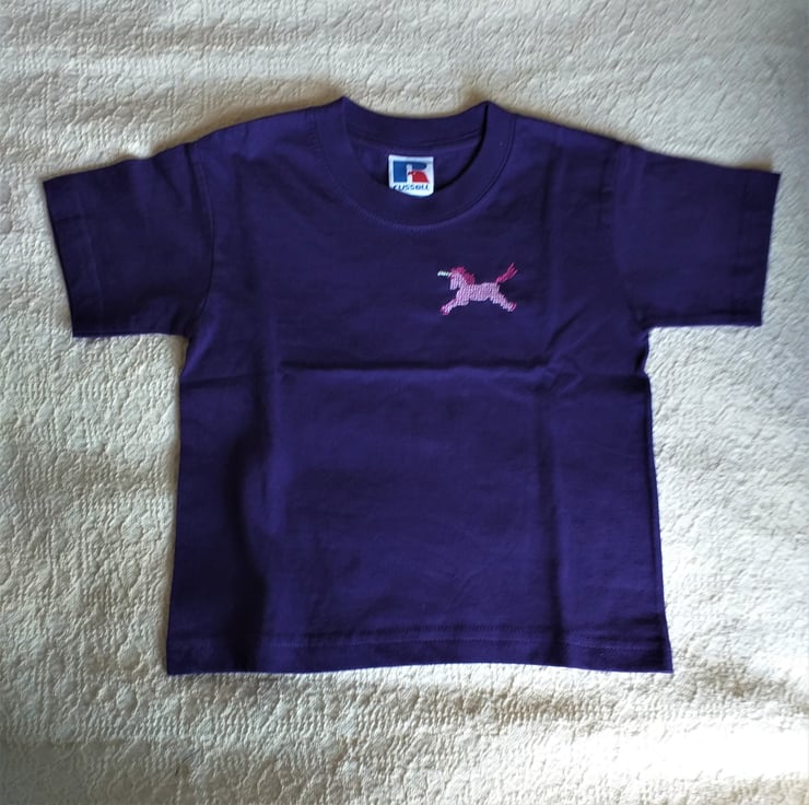 Are there any little girls who don't love unicorns? This is a lovely soft, deep purple T-shirt, enhanced by the prancing pale pink unicorn with magenta mane and tail and a sparkly horn I have hand-embroidered on the front. I never use a backing material when embroidering kids' clothing, so there is nothing inside this shirt to irritate your child's skin. The shirt has short sleeves. It is 100% cotton and can be machine washed.
