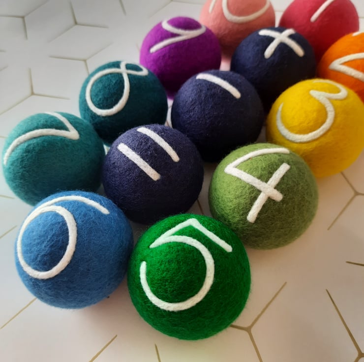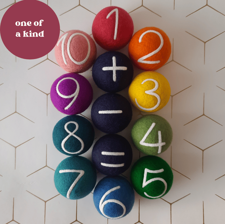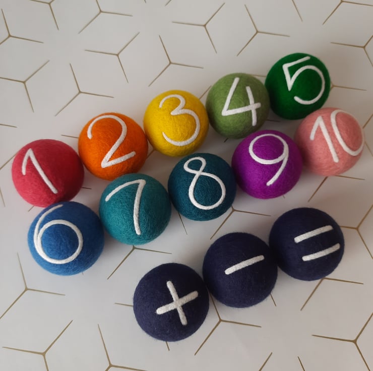 We carefully wet felt 100% Merino Wool roving around each sphere, creating a soft, smooth base to needle felt each number & symbol to complete this learning set that would make a generous, thoughtful gift for a special birthday & other occasions.