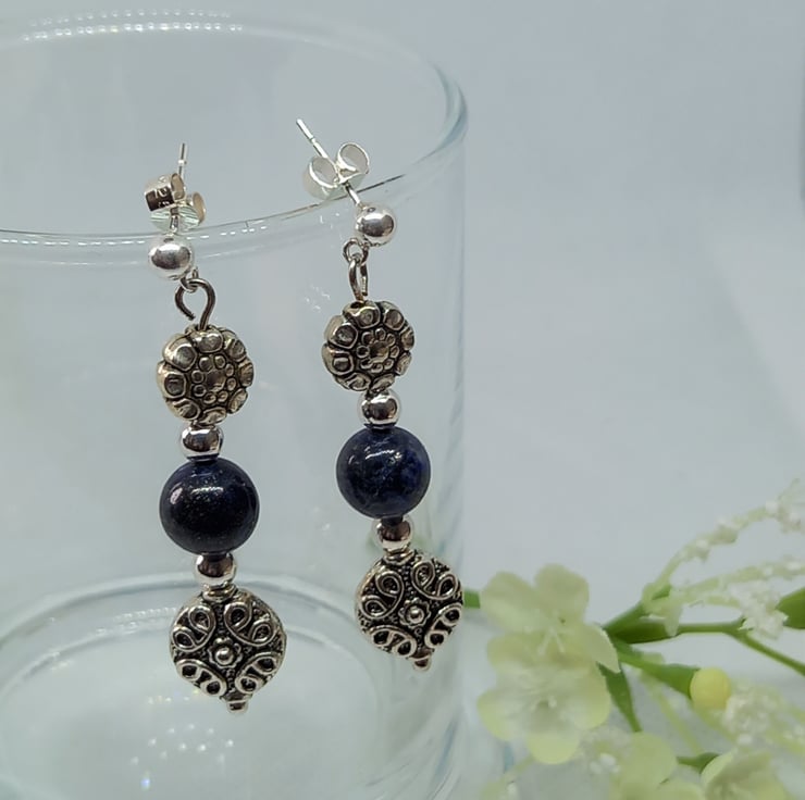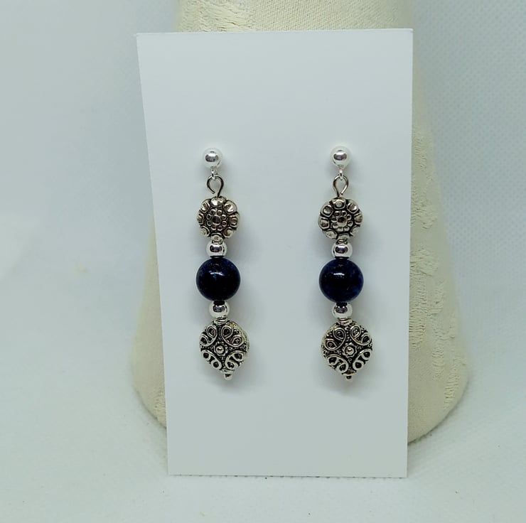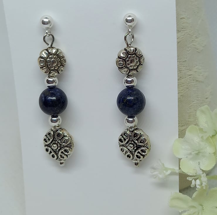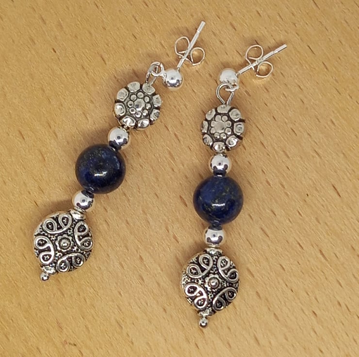Lots of texture in these earrings, featuring 8mm lapis lazuli beads with large tibetan silver beads and silver tone spacer beads. The beads are threaded onto silver plated headpins and hang from sterling silver studs with sterling silver scrolls to hold them in place.