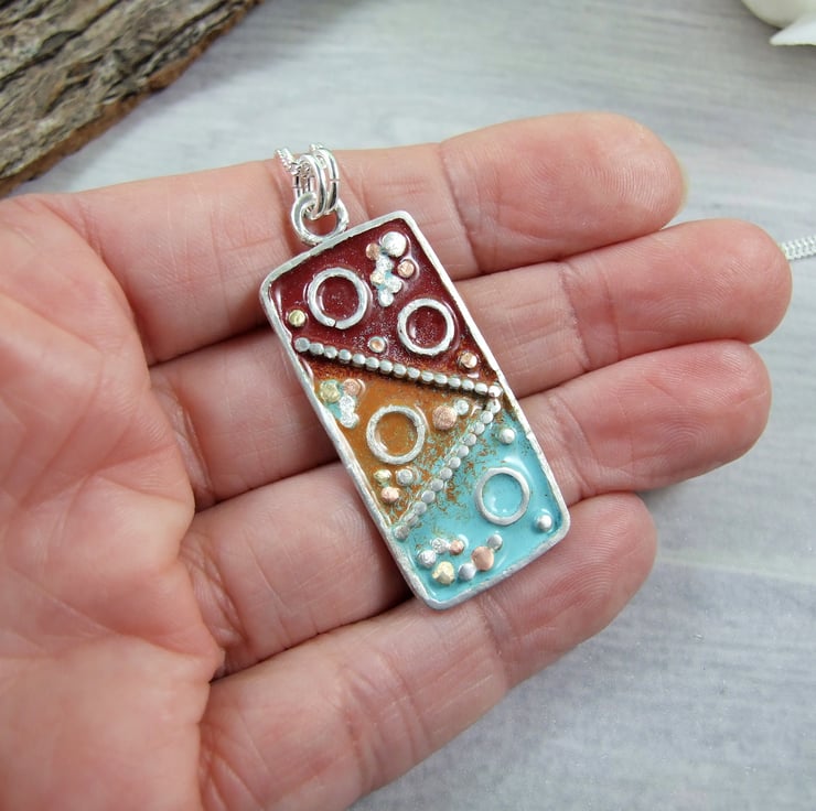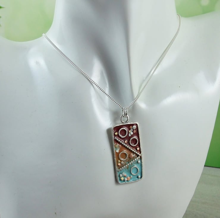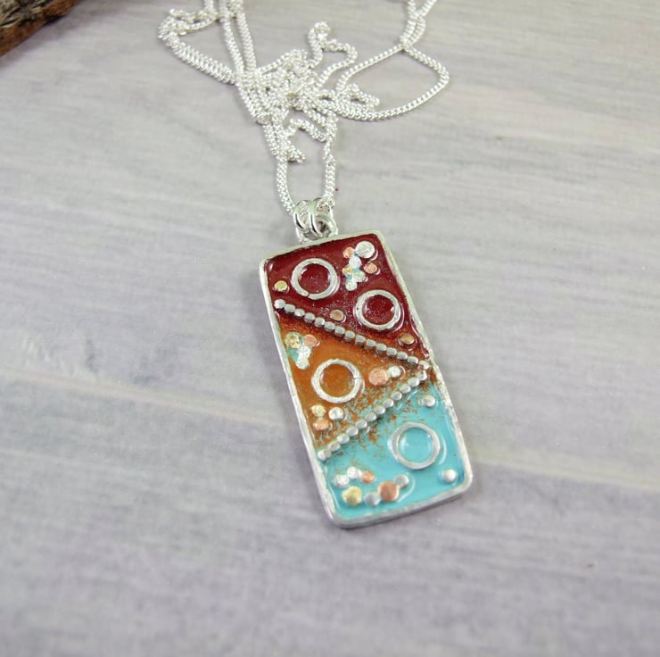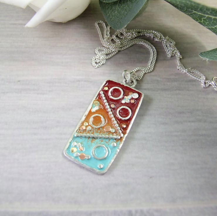 The necklace is entirely handmade in a freeform abstract design with silver wire and bead accents. The design has been created with silver sheet for the base and silver wire for the outlines and tiny individual beads with Efcolour low fire enamels for the colours.