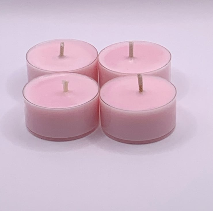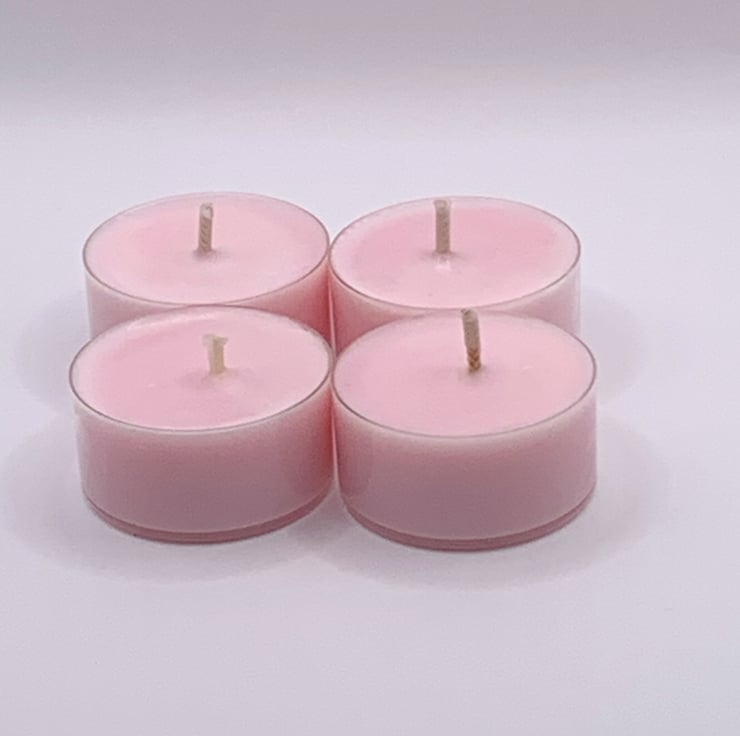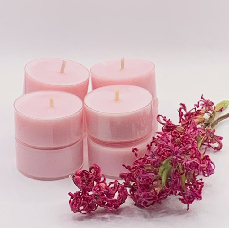These tea lights are made of 100% soy wax and are medium scented with gardenia essential oil. Gardenias are a fragrant white flower, that have very fresh floral woody feminine scent. These tealights have been dyed light pink.