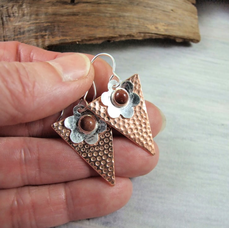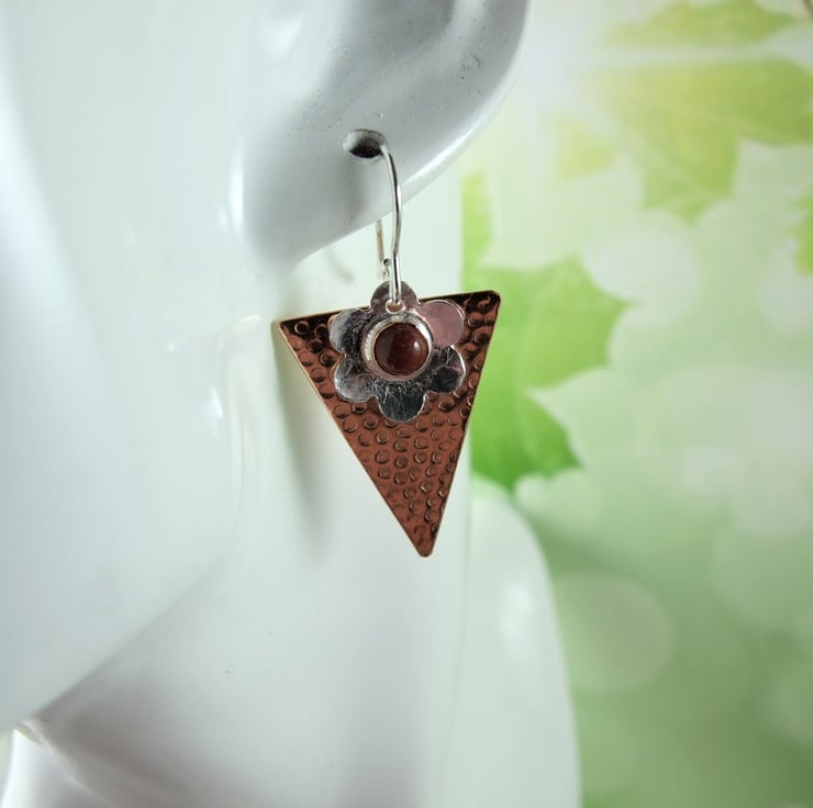 Sterling and Copper Triangle Earrings. Copper Patterned Triangles with silver flower set with red jasper gemstones and sterling silver ear wires.