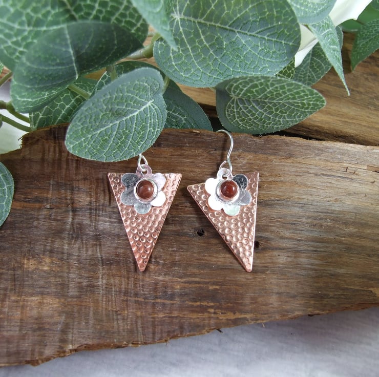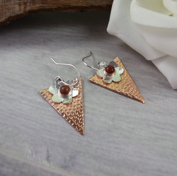 I have created the triangle shapes from copper sheet and textured them with a pattern texture. To this I have then added a sterling silver flower shape and set a little copper bezel at the centre of each flower which holds a small 5mm red jasper gemstone. Fitted to sterling siver earwires.