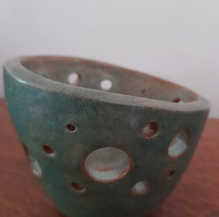Handmade ceramic pot with hole shaped decoration. Finished in green glaze & copper leaf. Size approx 10cm by 10cm, higher edge on one side.