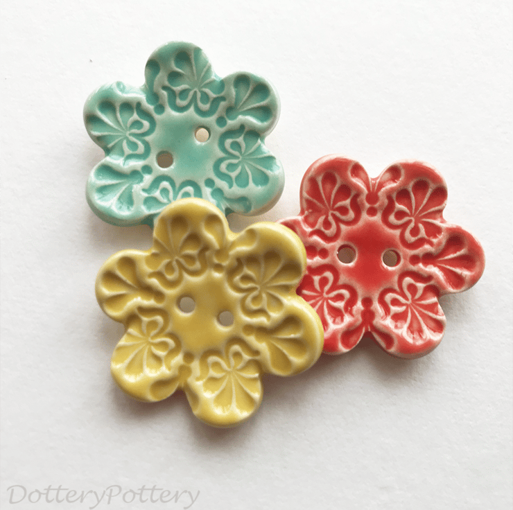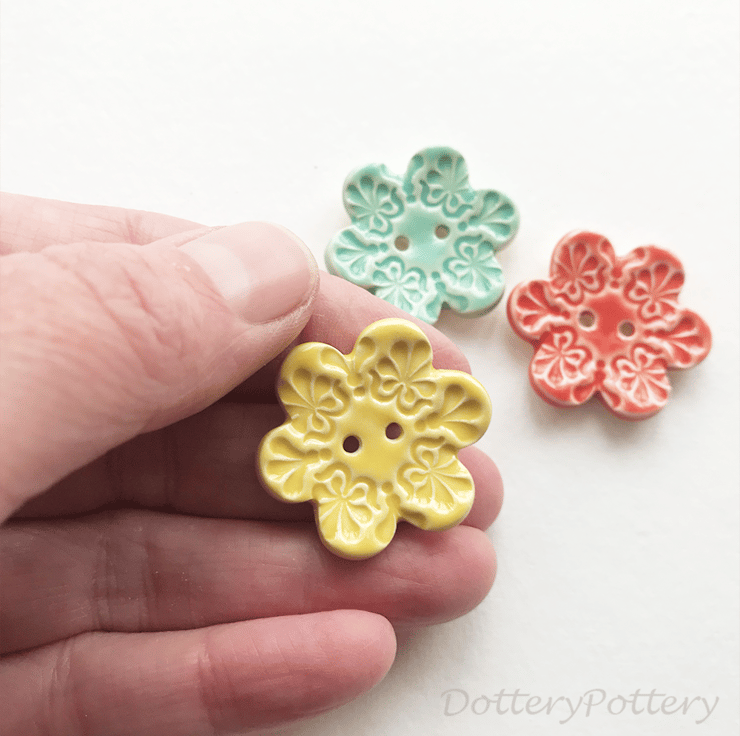 This set of three flower shaped pottery buttons are made from white earthenware clay, embossed and glazed on the front. They are then fired to 1100 degrees, so nice and strong. They measure 2.8cm. They can be handwashed or machine washed on a low temperature. Perfect for all sorts of arts and craft projects