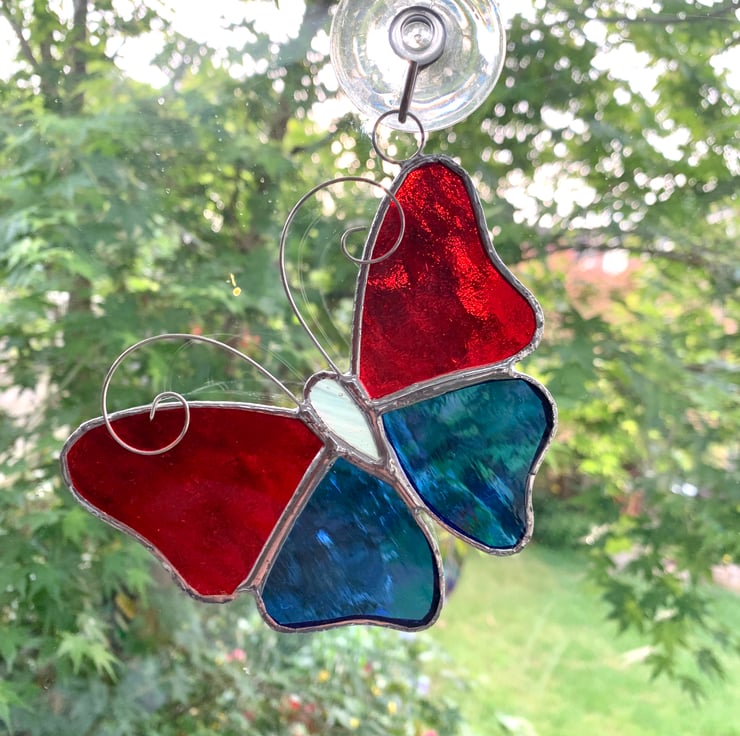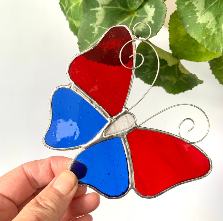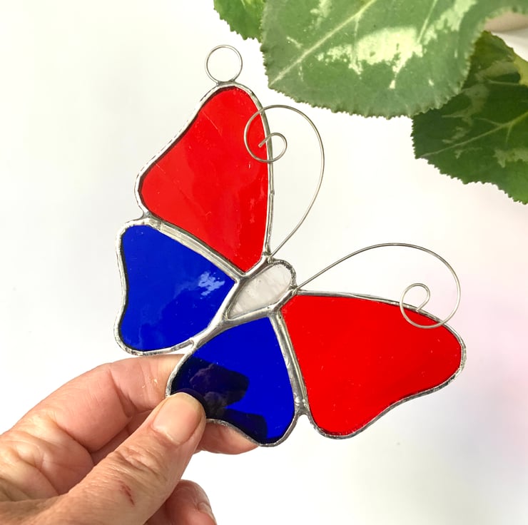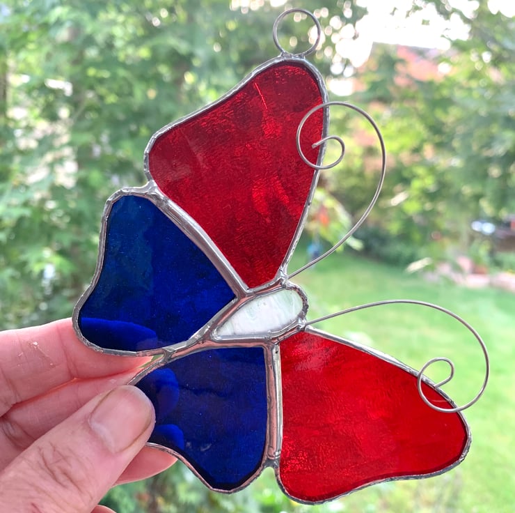 These butterflies have been made from a blue textured glass and red textured glass for the wings and white streaky glass for the body.