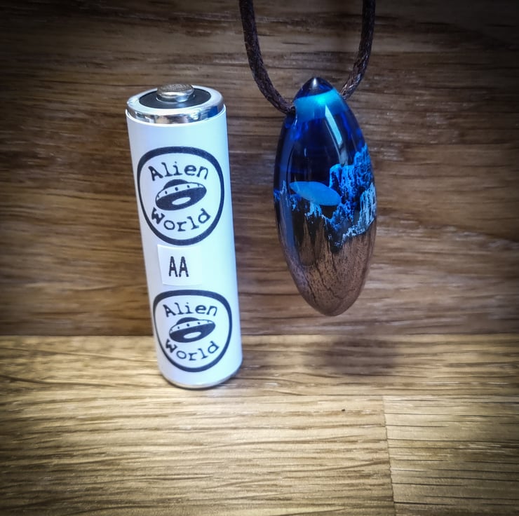 Make your friends jealous with this beautiful pendant with a crashed UFO on a mountain range. Made out of solid oak and resin in striking Navy.