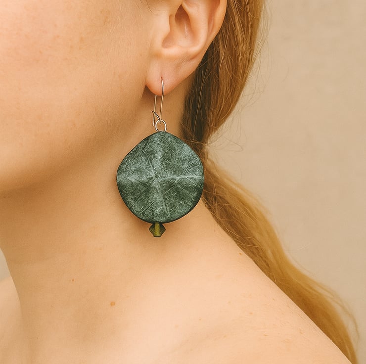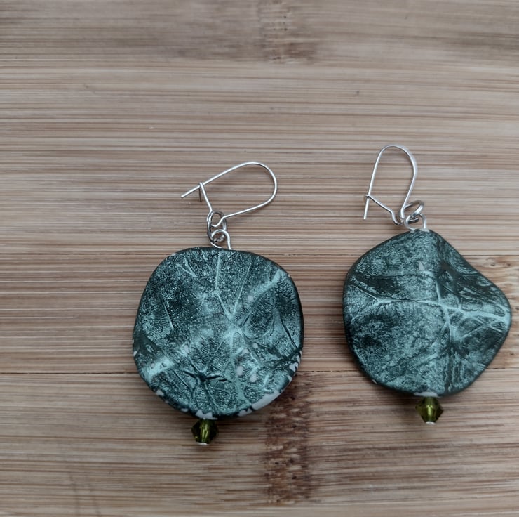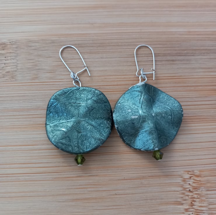 Large green bead together with a green crystal bicone and silver plated earwires and the earrings will come to you in an organza gift bag. A gift bag can be purchased separately. Earring drop is 1.25 inches (3cm)