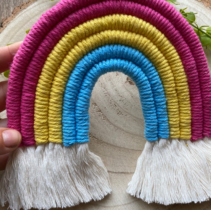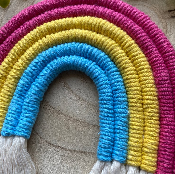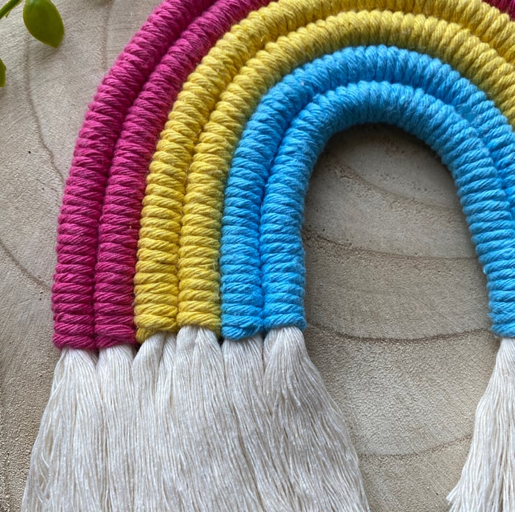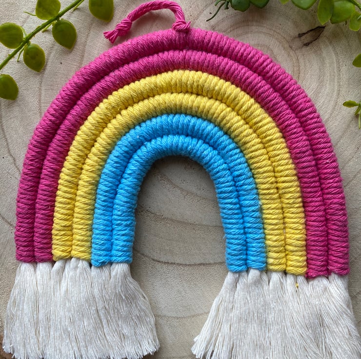 Handmade using recycled cotton cord in fuchsia pink, sunshine yellow and sky blue, to represent the colours of the Pansexual pride flag.