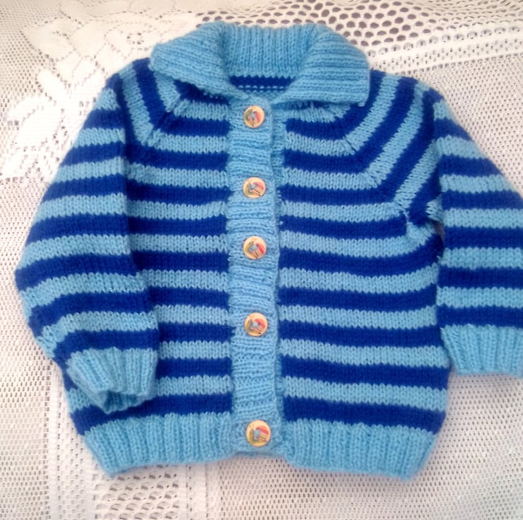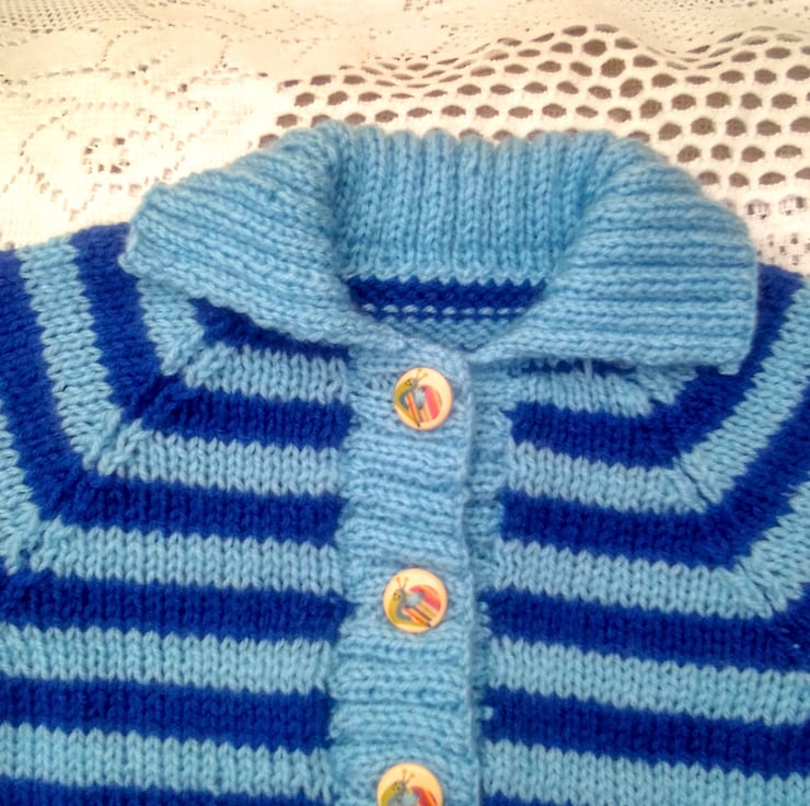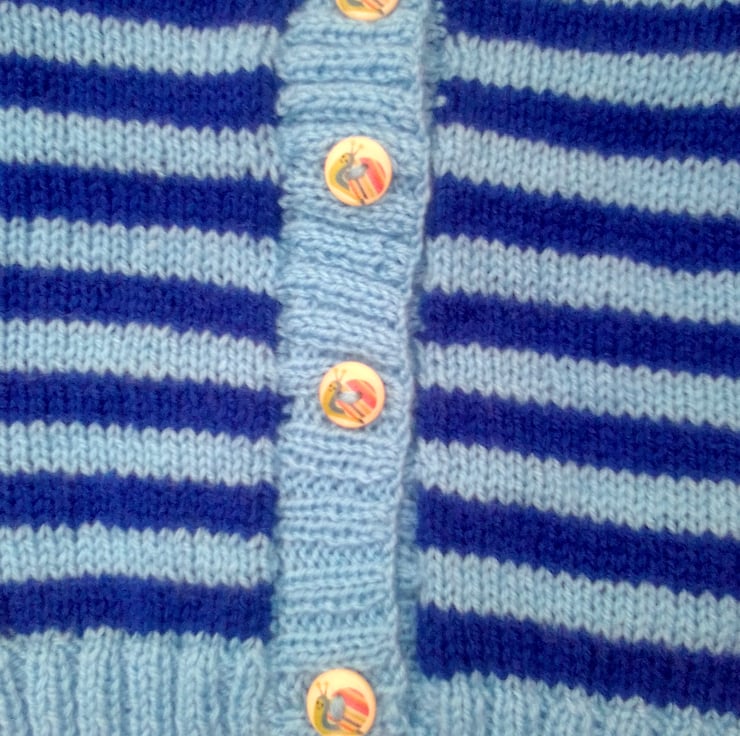This practical and warm hand knitted jacket with a colour made using a soft acrylic double knitting yarn, and it is fastened with 5 fun wooden buttons with cute little snails on them. It would make an ideal gift for a baby shower, for a new baby or for you own little ones to keep them snug and cosy this winter.