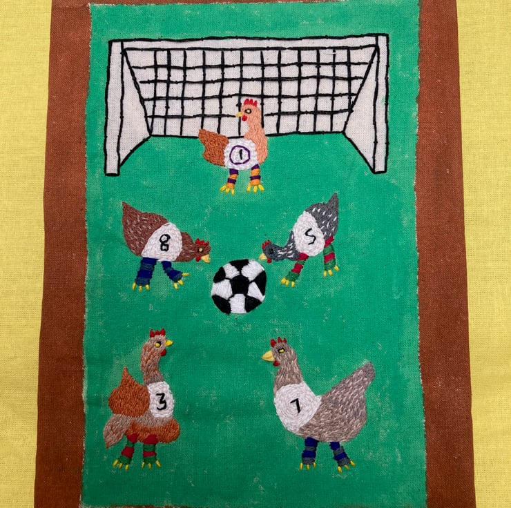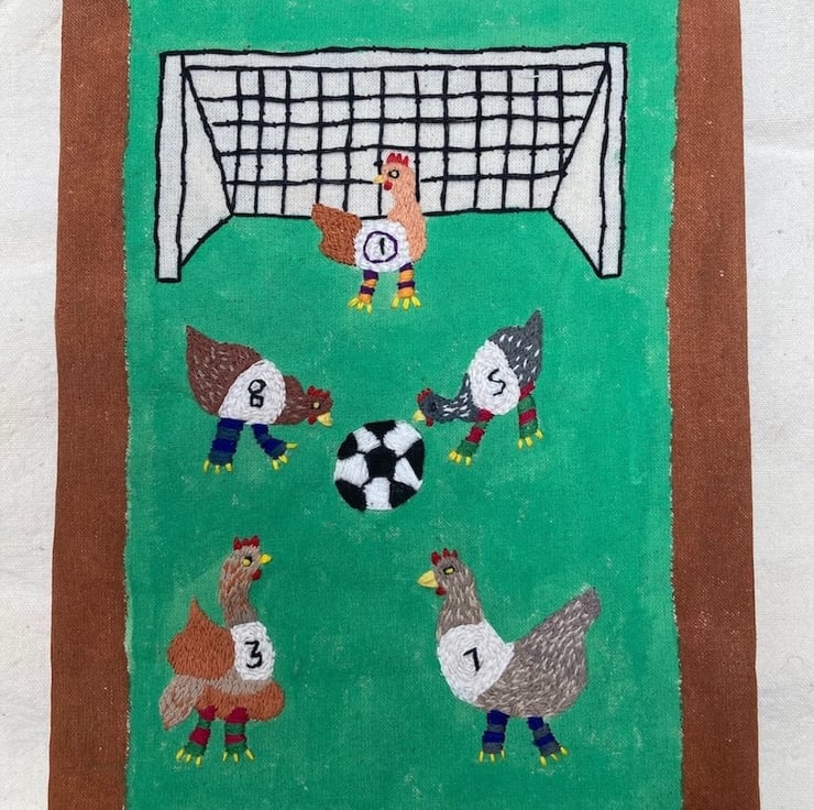 This whimsical picture of some chickens playing football has been hand embroidered onto a linen painted acrylic background & mounted on display board to make a charming & fun little piece of art which measures 15.5 cm x 21 cm. The picture is backed with cream linen & there is a small piece of ribbon attached at the back to hang the picture up with. Alternatively, you could frame the piece in a frame of your choice.