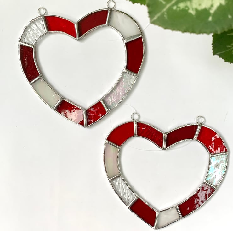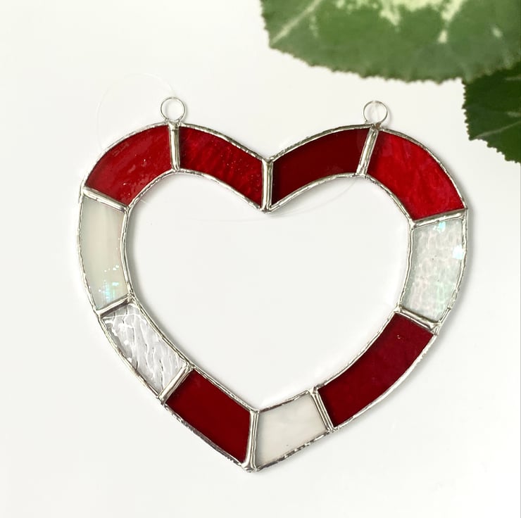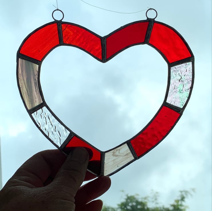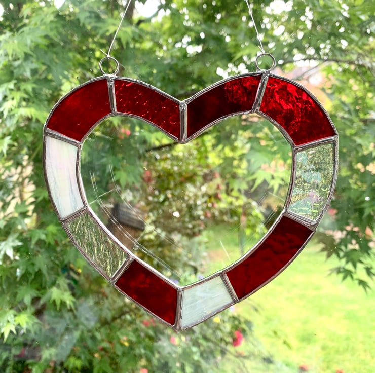 This suncatcher has been made using 10 different types of red stained glass, white streaky glass and clear textured glass.