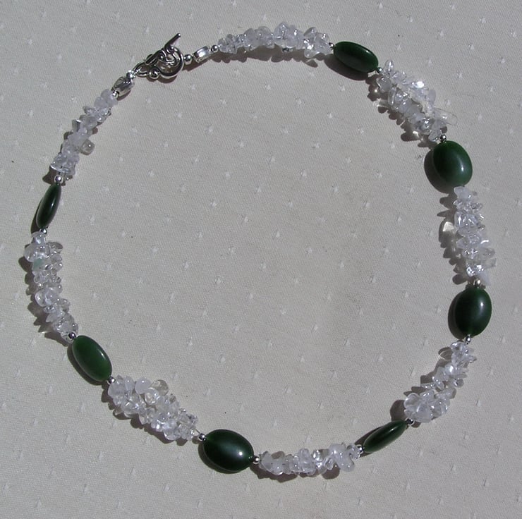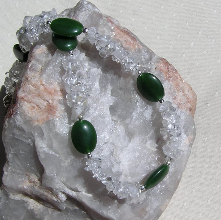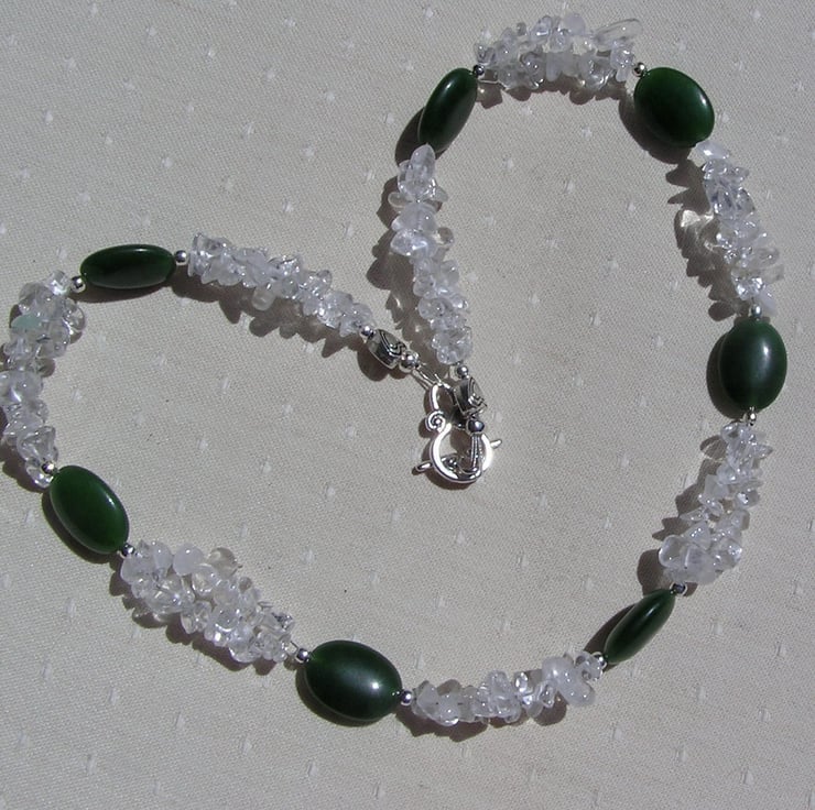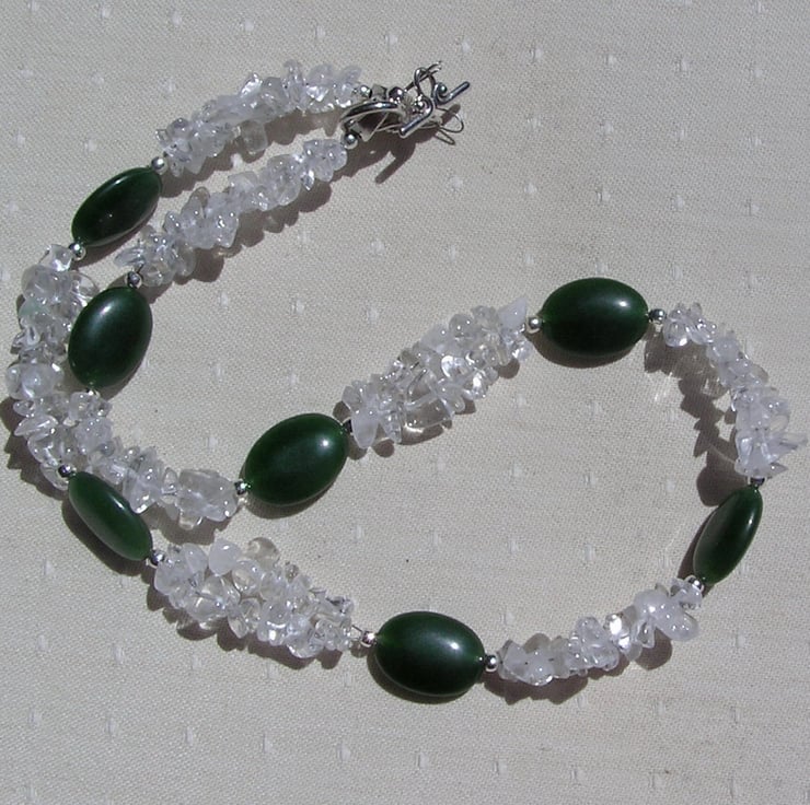 This Stunning Necklace is made from Green Nephrite Jade Chunky Oval Beads each separated by double stranded Clear Quartz Gem Chips- A Contrasting Fresh combination that will look stunning either worn casually or with something more Elegant for a Special Evening out