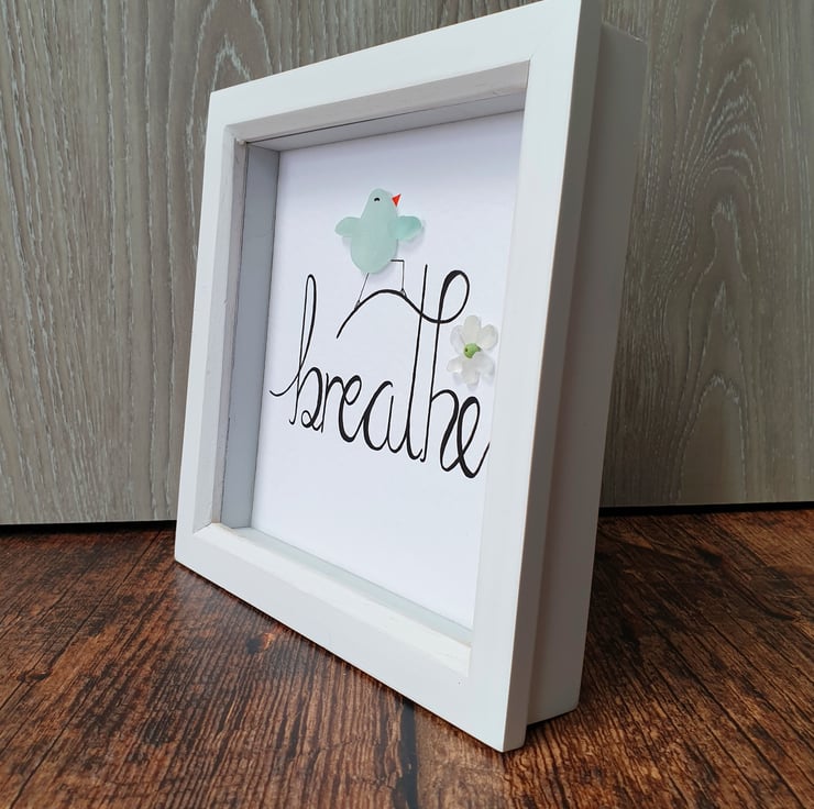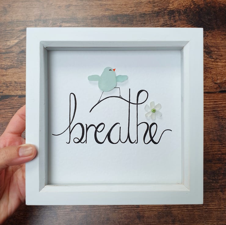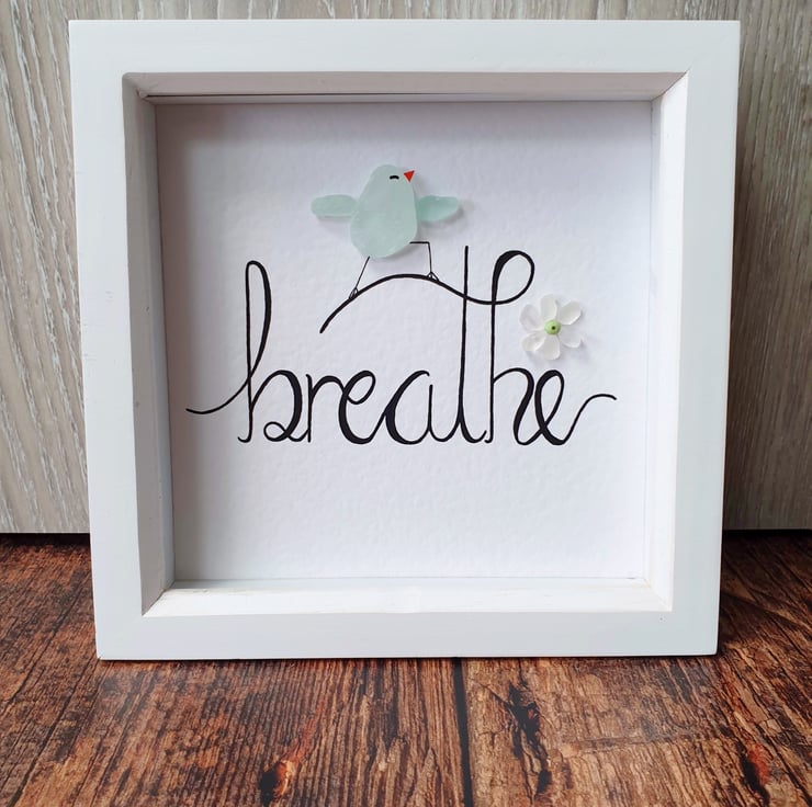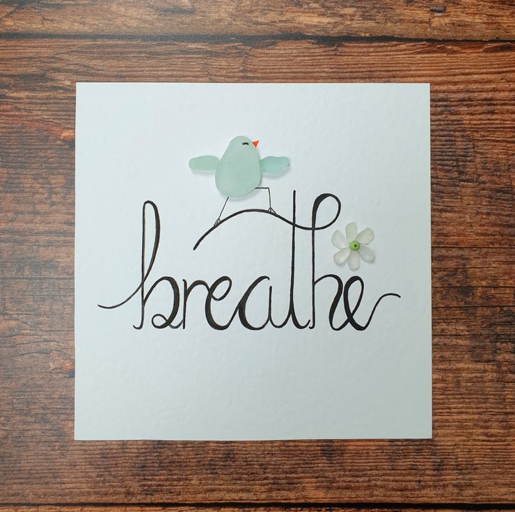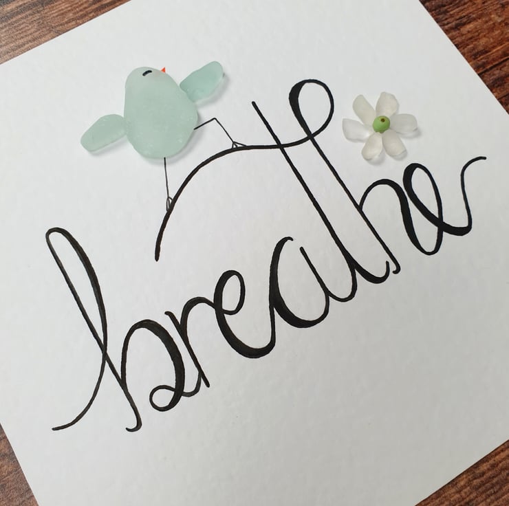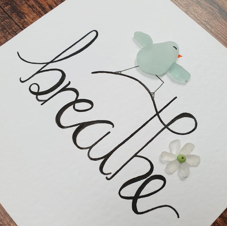 Script handwritten BREATHE with genuine pale green sea glass yogi bird and sea glass flower with a special sea worn bead on white textured card.