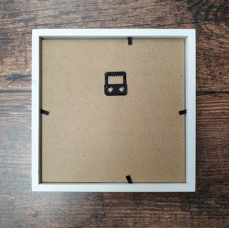 The white frame measures approximately 19cm by 19cm. All photos except for the last one were taken without glass to avoid reflections.