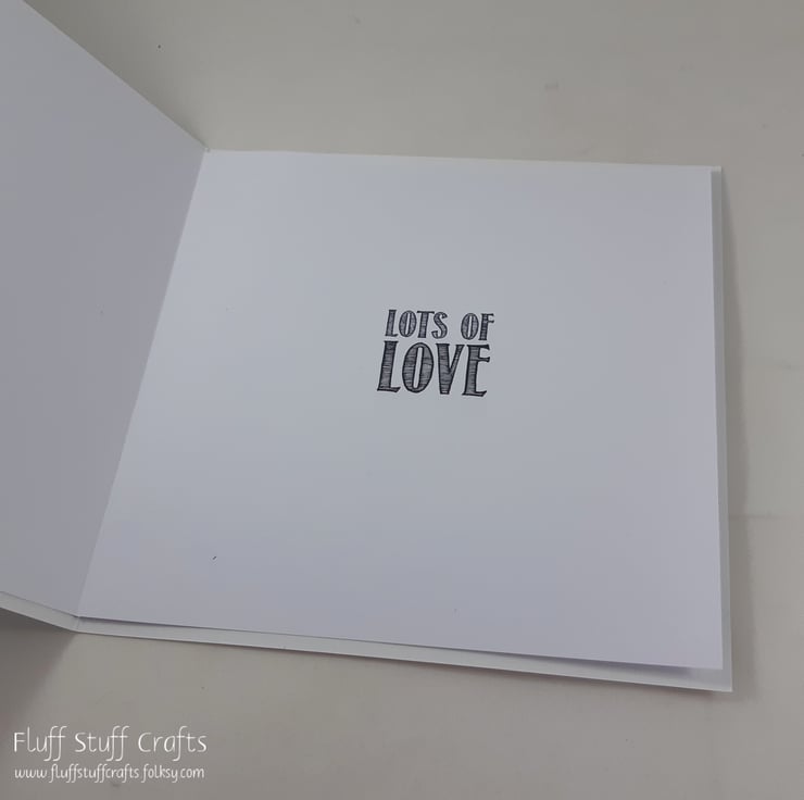 The card measures approximately 14.5 cm (5.75 inches) square and comes with a white envelope. It will be sent out in a compostable/biodegradable wrapper.