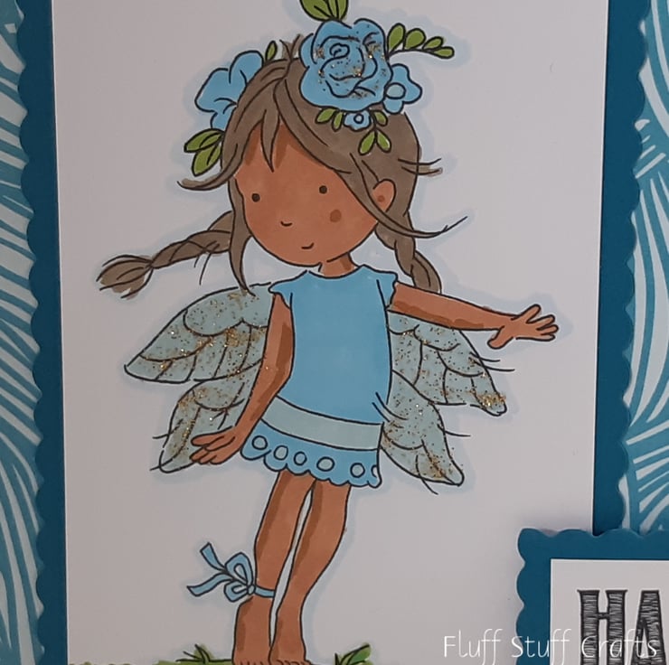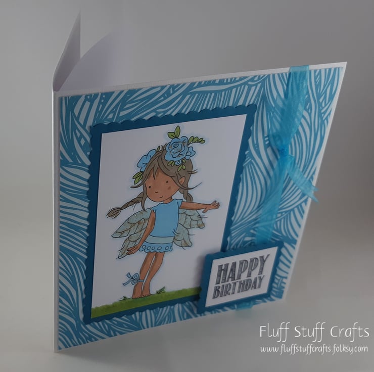 Square birthday card featuring a hand coloured fairy wearing a teal dress and glittered wings. She has been mounted onto teal card, along with the sentiment 'Happy Birthday' and overlaid onto a coordinating patterned background. The card has been further embellished with a length of matching organza ribbon tied in a knot. The message inside reads: 'Lots of Love'.