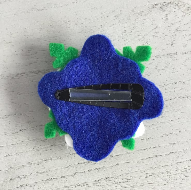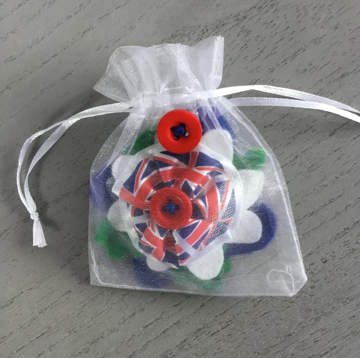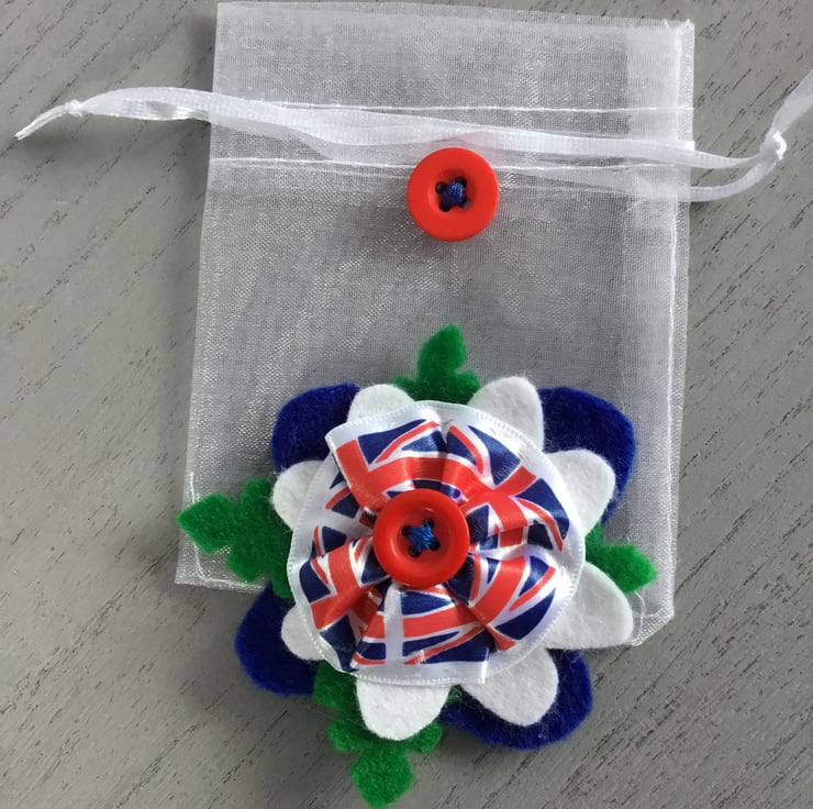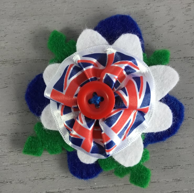 This Jubilee Flower Hair Slide is in blue, red and white, matching the colours of the Union Jack flag ribbon at the centre of this felt flower. This satin Union Jack ribbon is secured with a red button and is stitched onto blue and white flower petals and green felt leaves.