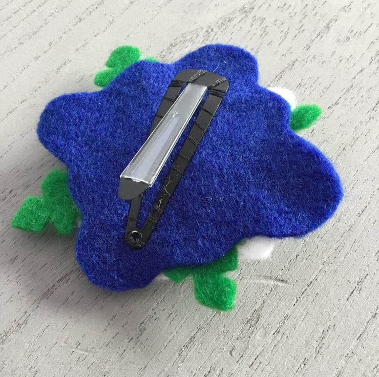 A black metal hair slide is stitched securely onto the back.