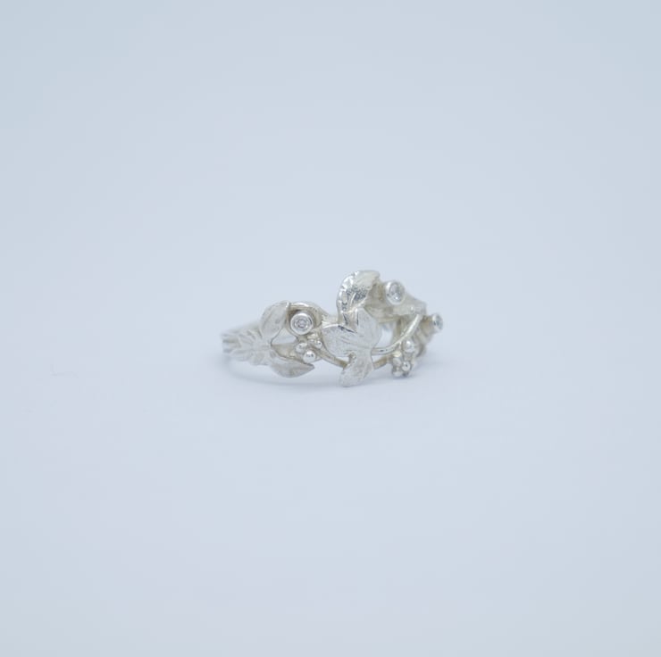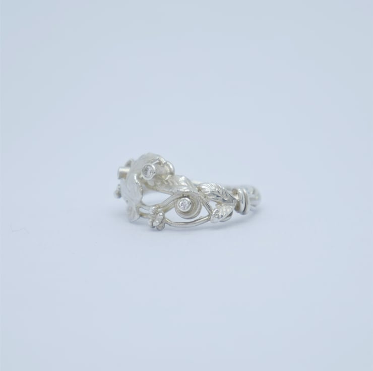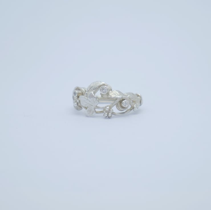 Based on a walk down a country lane with blackberries growing in the hedges , this would look lovely with rubies in or rhodolite stones to represent the colour of the blackberries. I have used diamonds in this one to symbolize water droplets sparkling on the leaves.