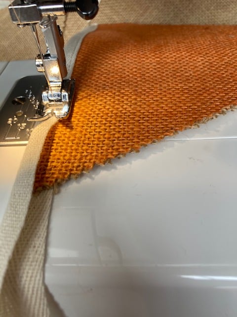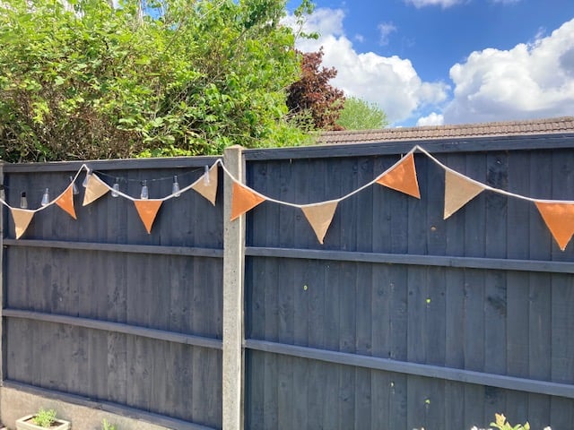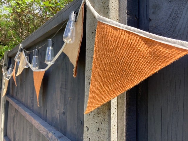 This outdoor bunting is made from natural jute and laminated coloured jute fabric with alternating beige and orange pennants. It is weatherproof and double-sided.