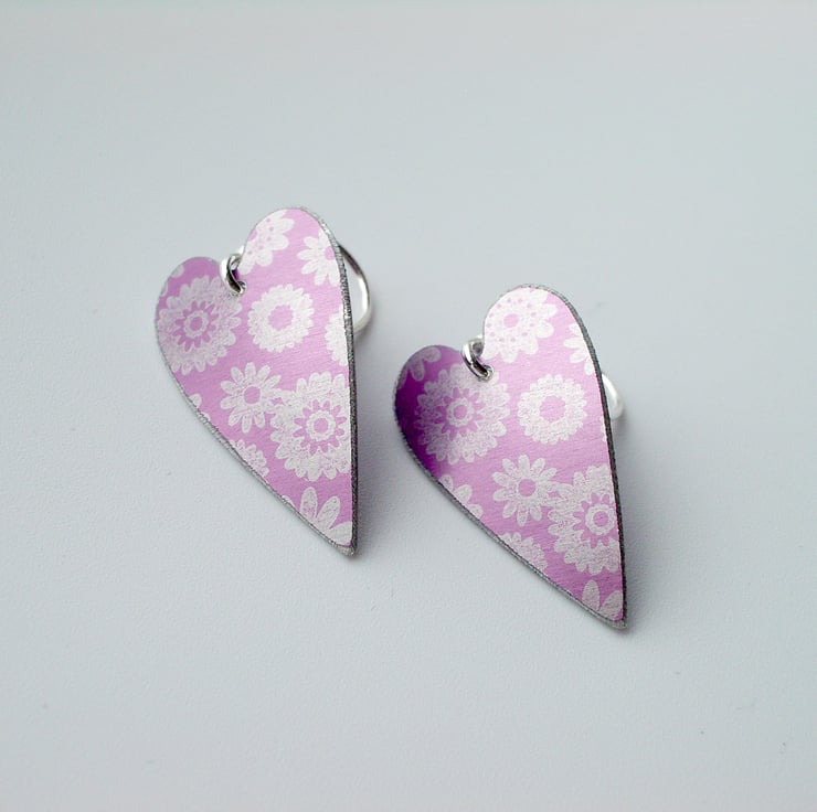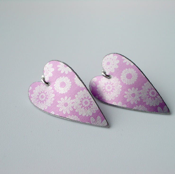 These heart earrings are made from aluminium which I have dyed in a light pink colour adding silver flower prints. I then seal the dye so that it becomes a permanent part of the metal. I cut out the heart shapes by hand, using a piercing saw, then dome them so that they catch the light.
