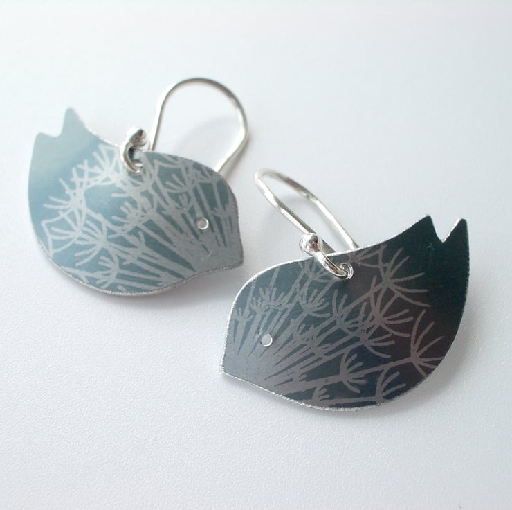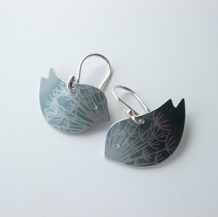 These bird earrings are made from aluminium which I have dyed and printed in light grey with contrasting silver dandelion seed prints. The bird shape is all hand cut using a piercing saw and I finish the edges with a file. Finally, I dome the bird slightly to give it depth and to make it catch the light.