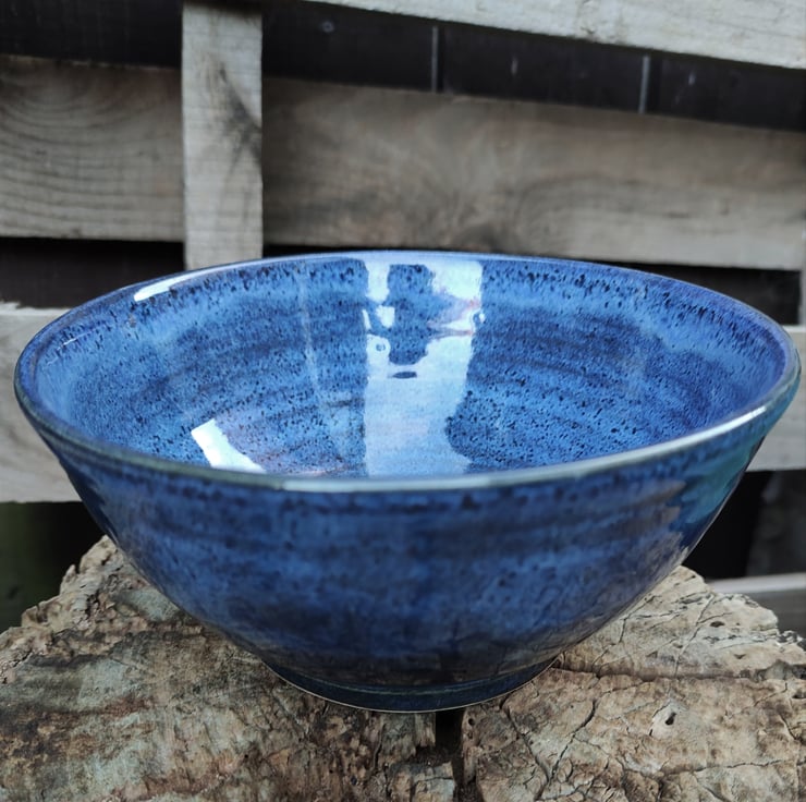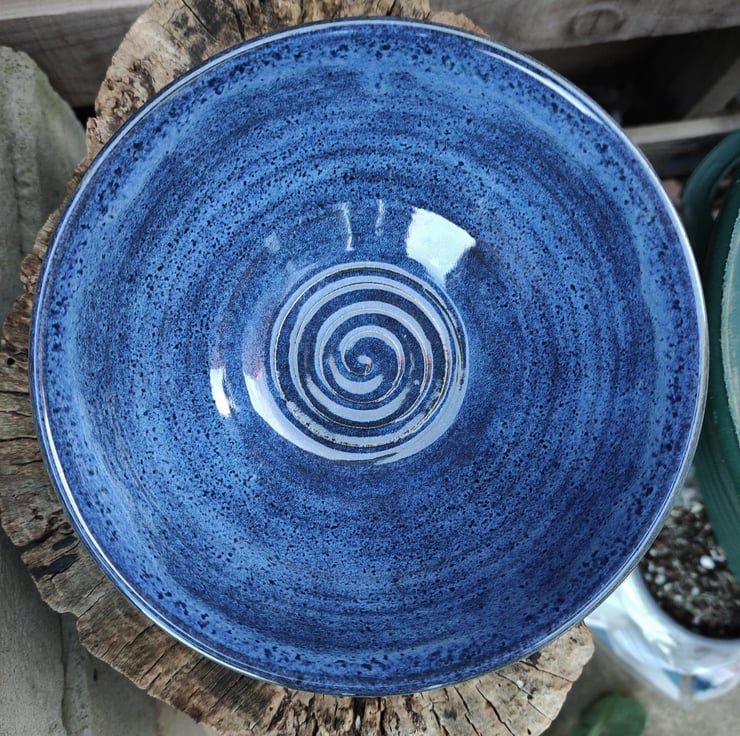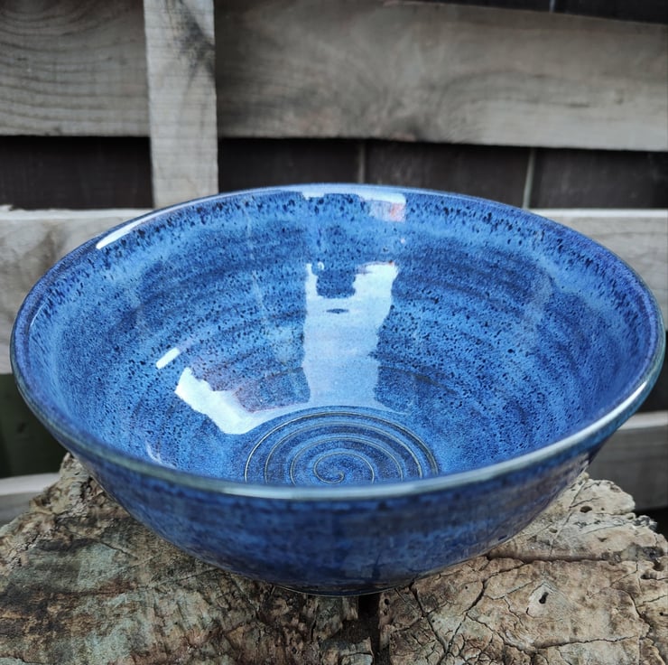 Smallish medium sized blue bowl with a swirl in the base...great serving bowl for your snack of choice, chips for dip etc. Love the way the blue glaze floats a little, coming out differently on every piece. It's also come up a bit speckly which is works for me!