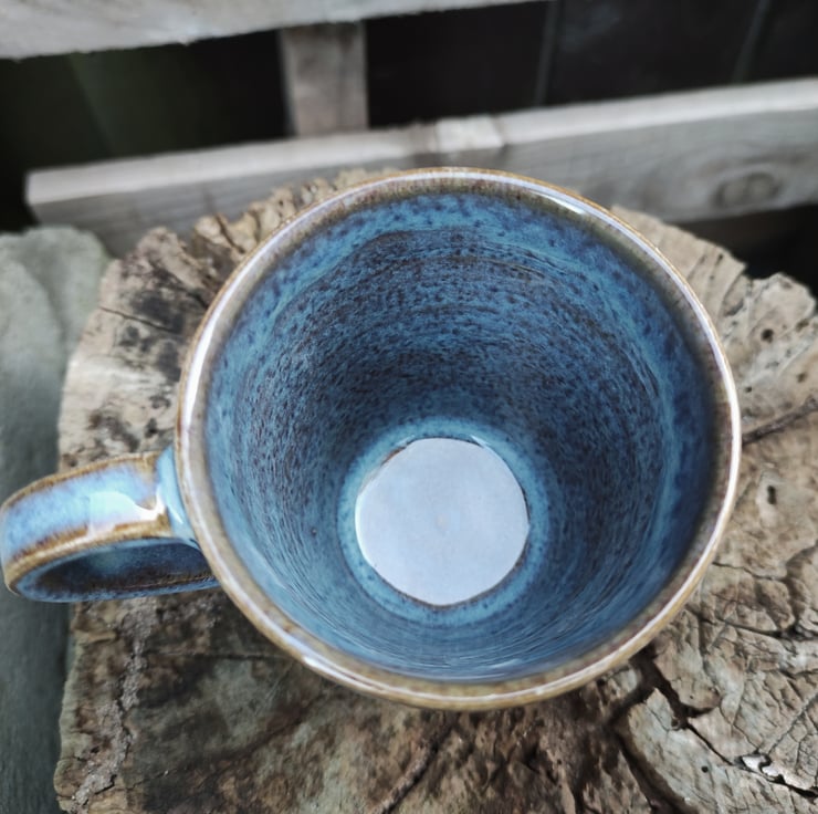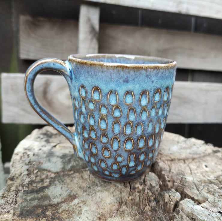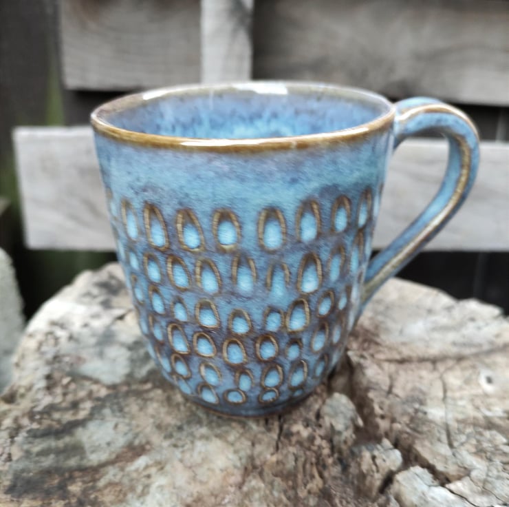 I call this my hedgehog design! Love the way the glaze floats down and flows differently over the cuts to hold more glaze and bring out the blue colour. Fired to c1230 degrees (stoneware temperature) which makes the cup more durable.