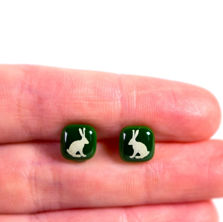 These little hare stud earrings are hand made from bright coloured opaque glass which is screen-printed with white kiln-fired enamel, with this rabbit design. If you would like the bunny printed in black glass enamel, this listing can be found in the Earring or Hare Collection in my shop.