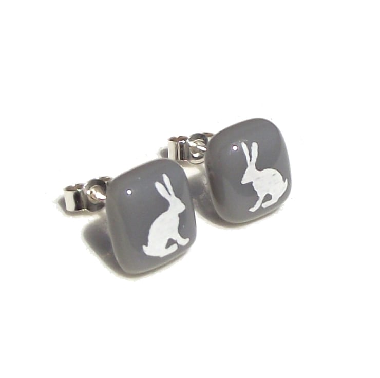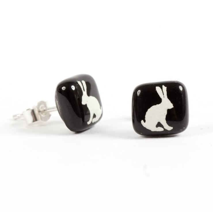 These little rabbit stud earrings use the original little sitting hare silhouette I created to make the water-jet cut glass sculptures and scaled down to a more wearable size. This was then worked into a screen-print image with glass enamel pulled through the screen onto the chosen coloured flat glass underneath. I have a rainbow choice of coloured flat glass in the studio and although I tend to limit the hare print to black or white, it could be printed in any glass enamel colour too.