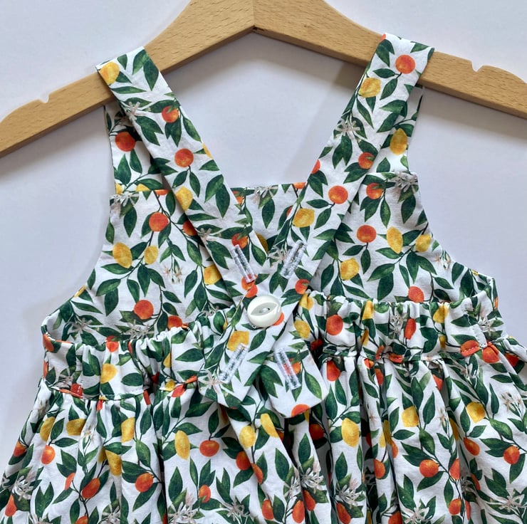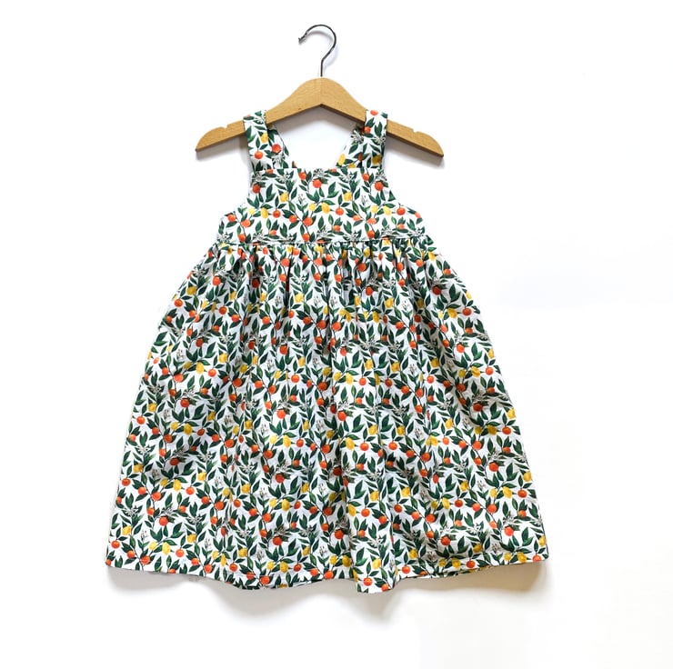 Handmade to order, this girls summer dress is made from white 100% cotton fabric with a beautiful citrus themed print, of oranges, lemons and their green vines.